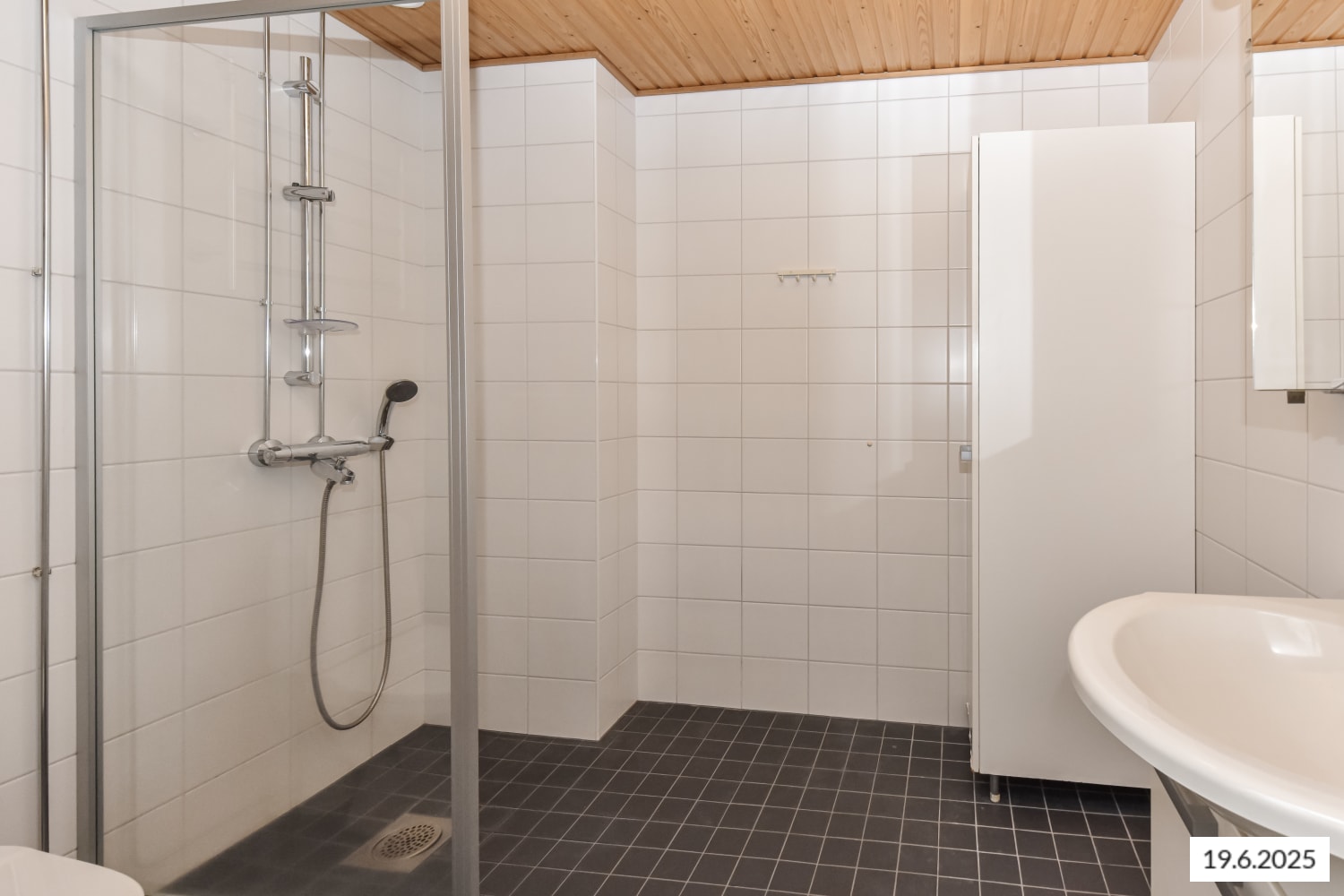 Asuinhuoneissa on pehmeän pähkinänsävyiset laminaattilattiat. Kylpyhuoneessa on mukavuuslattialämmitys, antrasiitinharmaa lattialaatoitus ja valkoiset, aavistuksen suorakaiteen muotoiset seinäkaakelit. Keittoseinäkkeen valkoiset kaapistot, kaunis vaalea köynnöskuvioinen kalustevälikaakelointi ja grafiitinharmaa työtaso sopivat mukavasti moneen makuun.