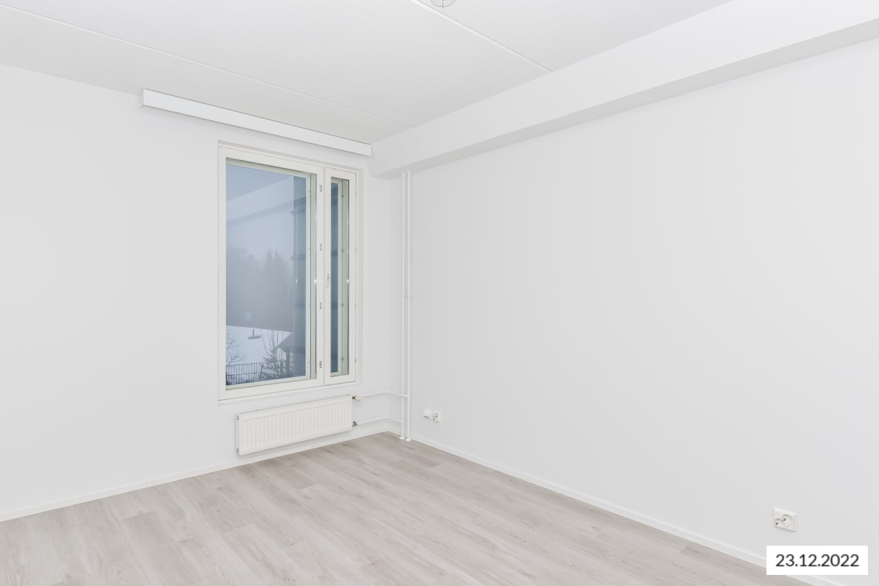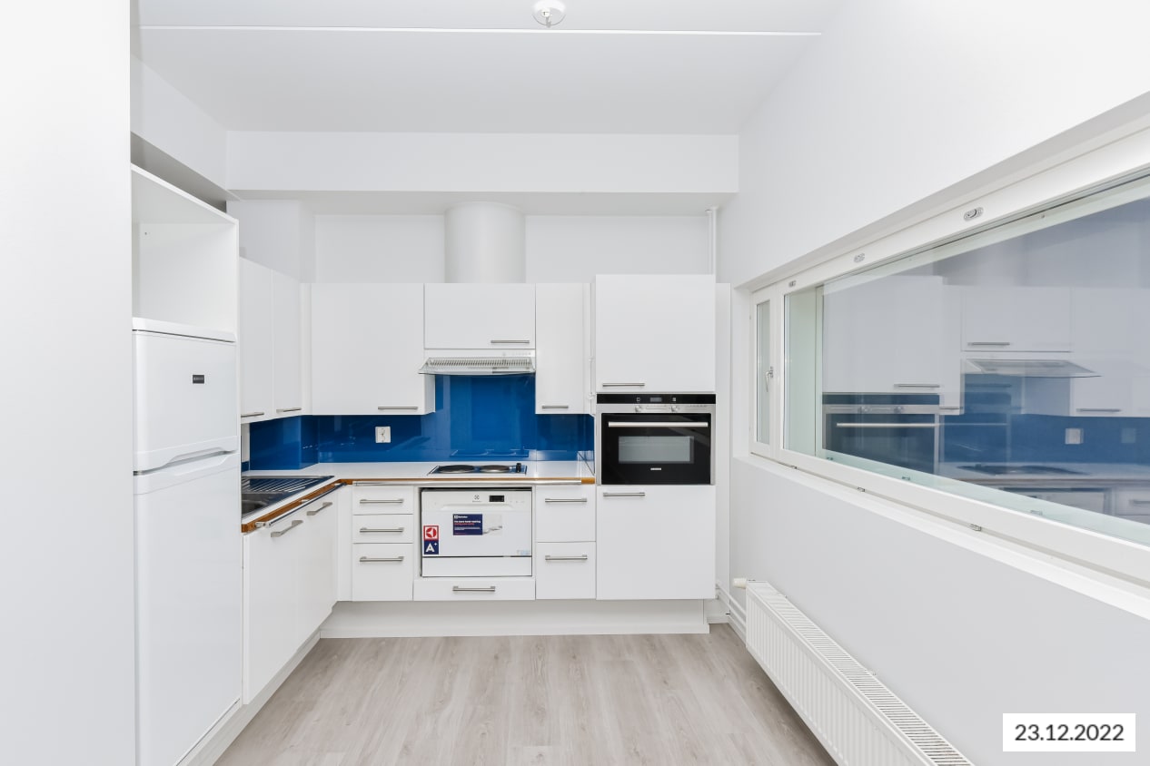 Sympaattisen kaksion valttina on parvekkeelta ja erityisesti keittokomeron ikkunasta avautuvat kauniit kalliomaisemat. Ilmava pohjaratkaisu sopii liikuntaesteisillekin ja kalusteissa on runsaasti kahvoja ja tukia kodissa liikkumisen helpottamiseksi. Asuinhuoneiden lattiat ovat tammiparkettia. Kylpyhuoneessa on inva-mitoitetut kalusteet, valkoiset kaakeloidut seinät ja lattiassa kosteiden tilojen liukuestemuovimatto. Keittokomerossa on valkoiset kaapistot ja kaunis vihreä tai tummansininen kalustevälilasi. Siemensin kaksilevyinen liesi on upotettu työtasoon ja mikroaaltotoiminnolla varustettu uuni on mukavasti työkorkeudella. Jää-pakastinkaappi on UPOn mallistoa ja astianpesukone Electroluxin.