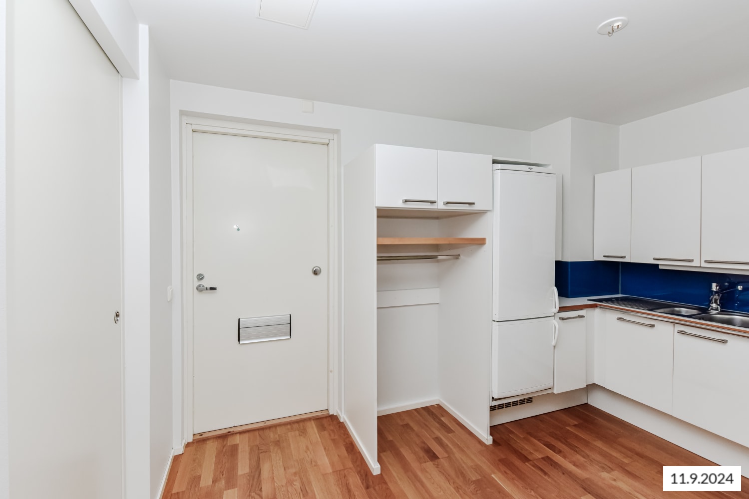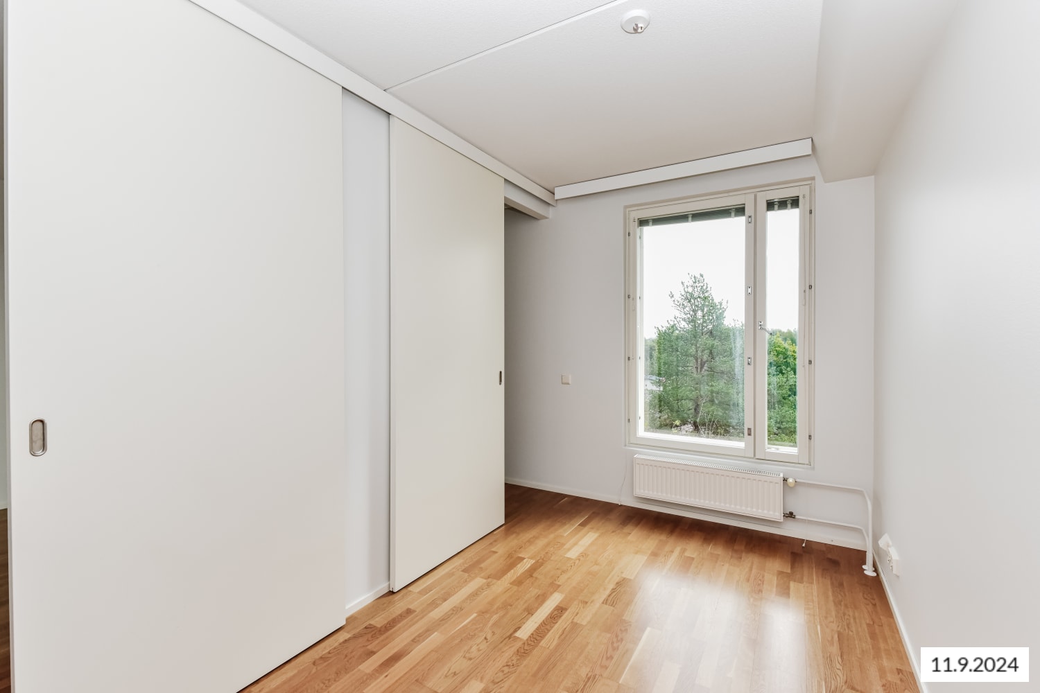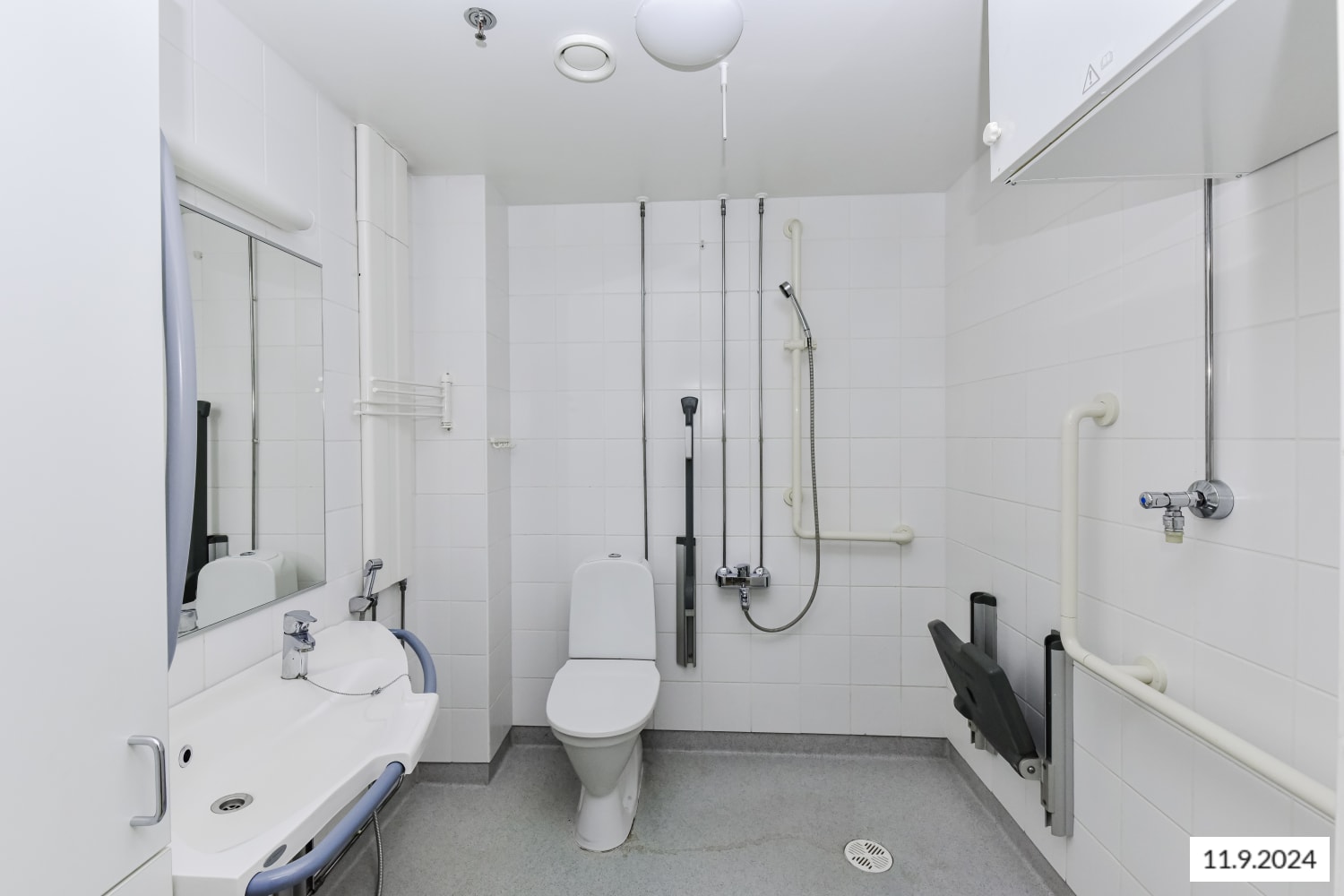 Rauhallinen ylimmän kerroksen kaksio sijaitsee fiksusti Palvelukeskus Kotikallion vieressä. Asunnon konstailematon pohjaratkaisu on mitoitettu liikuntaesteiselle sopivaksi ja kalusteissa on runsaasti kahvoja ja tukia kodissa liikkumisen helpottamiseksi. Korkeista ikkunoista avautuu kaunis näkymä yli pihapuiden. Asuinhuoneiden lattiat ovat tammiparkettia. Kylpyhuoneessa on inva-mitoitetut kalusteet, valkoiset kaakeloidut seinät ja lattiassa kosteiden tilojen liukuestemuovimatto. Keittokomerossa on valkoiset kaapistot ja kaunis vihreä tai tummansininen kalustevälilasi. Siemensin kaksilevyinen liesi on upotettu työtasoon ja mikroaaltotoiminnolla varustettu uuni on mukavasti työkorkeudella. Jää-pakastinkaappi on UPOn mallistoa ja astianpesukone Electroluxin.