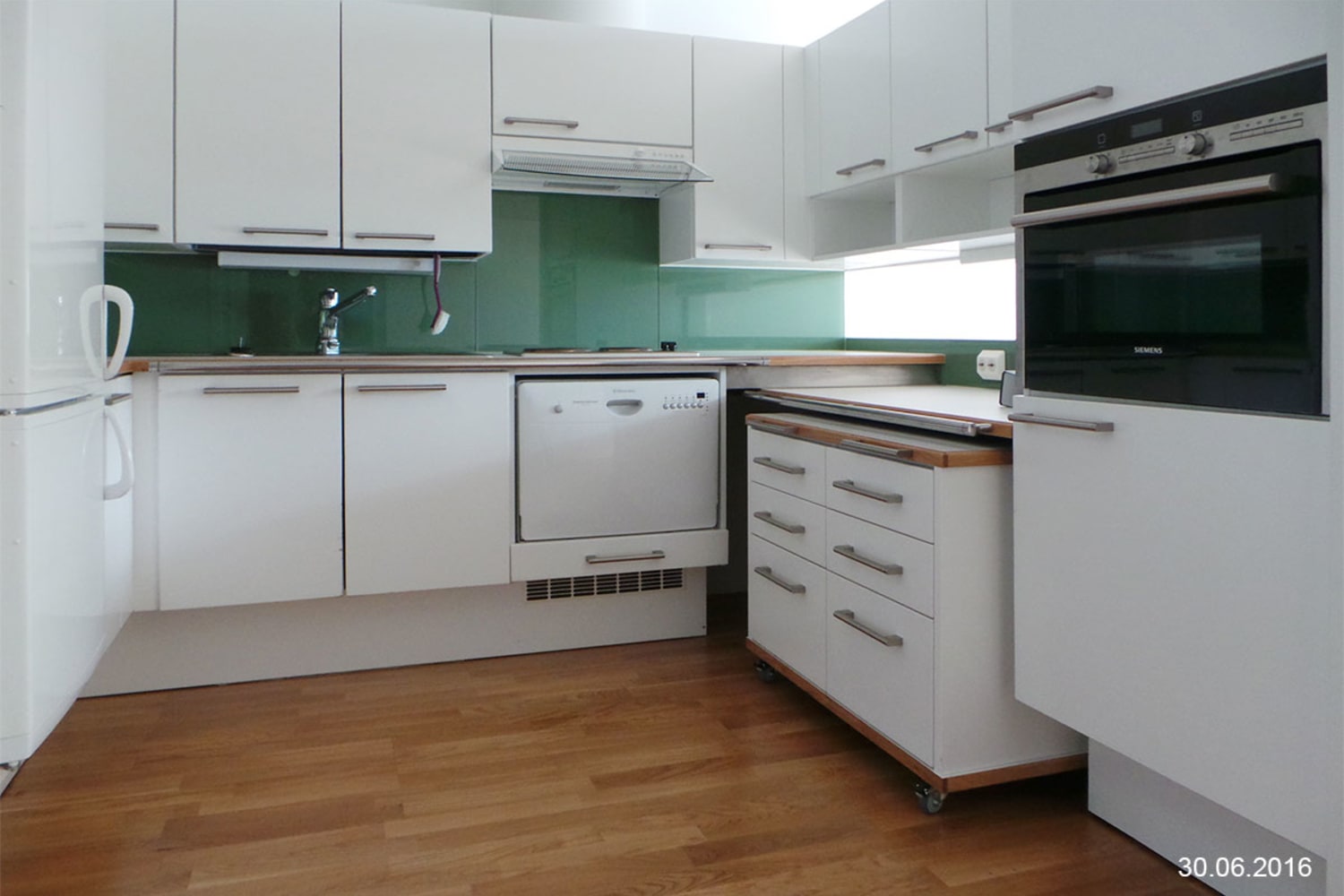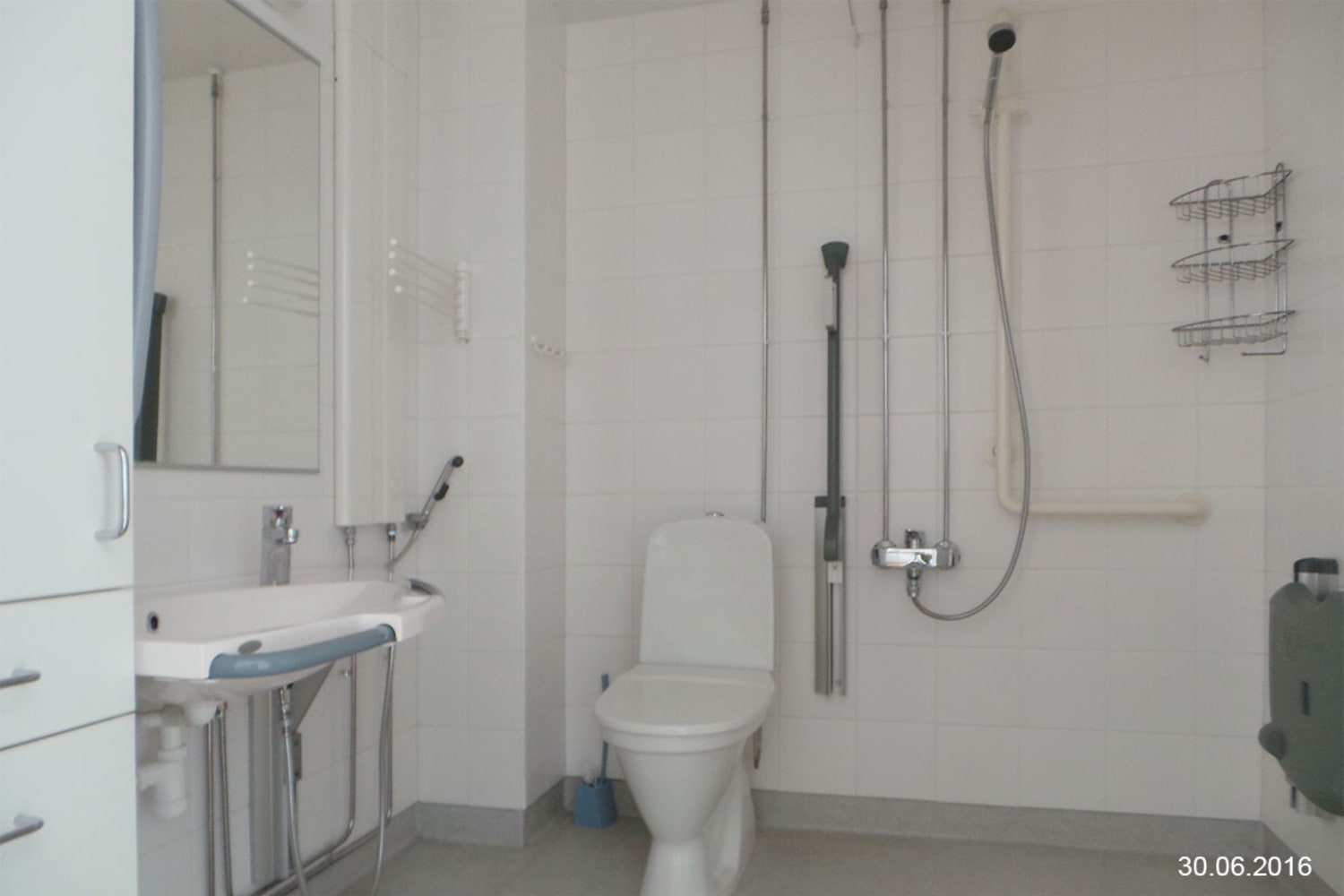 Palvelukeskus Kotikallion vieressä sijaitsevan mukavan kaksion parhaita puolia ovat tilava vaatehuone ja korkeat, tilan tuntua lisäävät ikkunat. Väljä pohjaratkaisu sopii liikuntaesteisillekin ja kalusteissa on runsaasti kahvoja ja tukia kodissa liikkumisen helpottamiseksi. Asuinhuoneiden lattiat ovat tammiparkettia. Kylpyhuoneessa on inva-mitoitetut kalusteet, valkoiset kaakeloidut seinät ja lattiassa kosteiden tilojen liukuestemuovimatto. Keittokomerossa on valkoiset kaapistot ja kaunis vihreä tai tummansininen kalustevälilasi. Siemensin kaksilevyinen liesi on upotettu työtasoon ja mikroaaltotoiminnolla varustettu uuni on mukavasti työkorkeudella. Jää-pakastinkaappi on UPOn mallistoa ja astianpesukone Electroluxin.