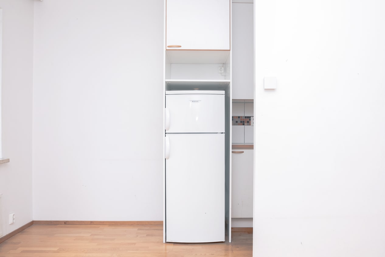 Keittokomerossa on jenkkimallinen jääkaappi sekä turva-ajastimella varustettu sähköliesi.