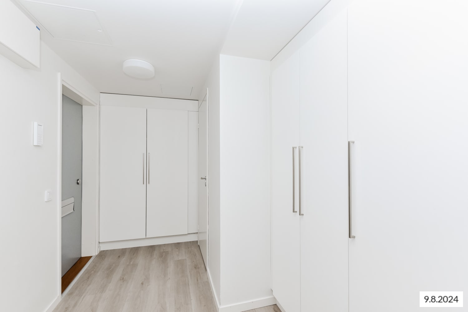 Kylpyhuoneessa on valkoiset Kide-malliston kotimaiset kalusteet. Seinät ovat valkoista laattaa ja lattia on harmaa. Pyykinpesukoneelle löytyy oma paikka. Tilavassa eteisessä on tavallista runsaammin komerotilaa.