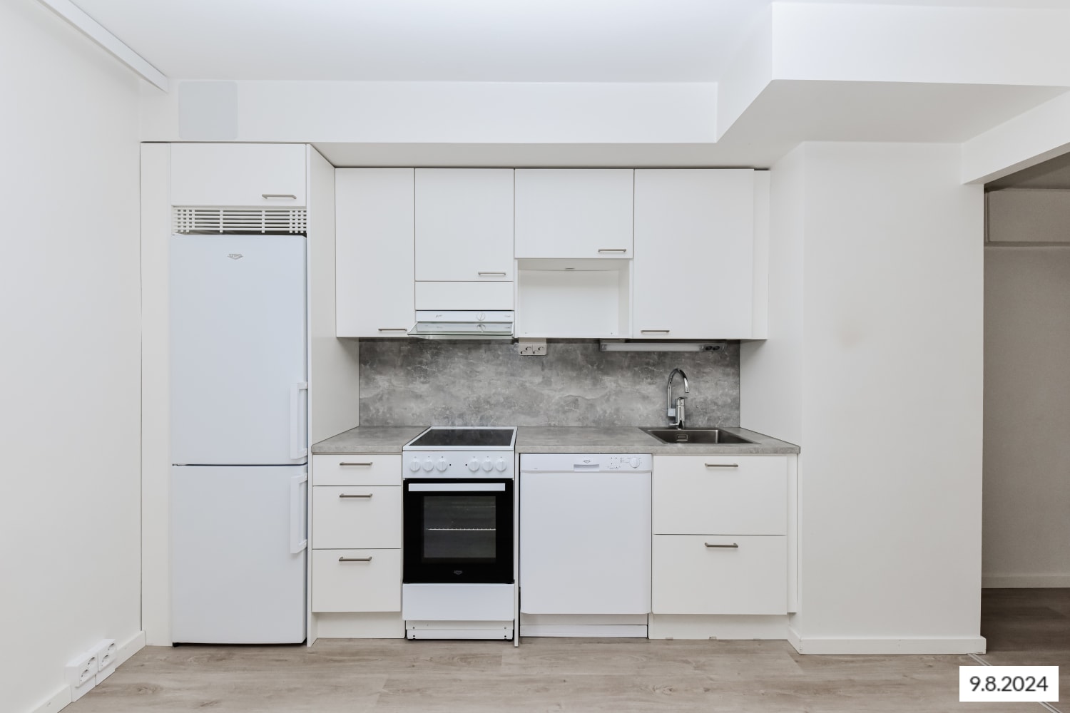 Keittiön kaapistot ovat raikkaan valkoiset ja ylä- ja alakaappien välinen tila sekä työtaso ovat harmaata laminaattia. Varustukseen kuuluu keraaminen liesi, liesikupu, jääkaappipakastin ja astianpesukone. Kodinkoneet ovat valkoisia.