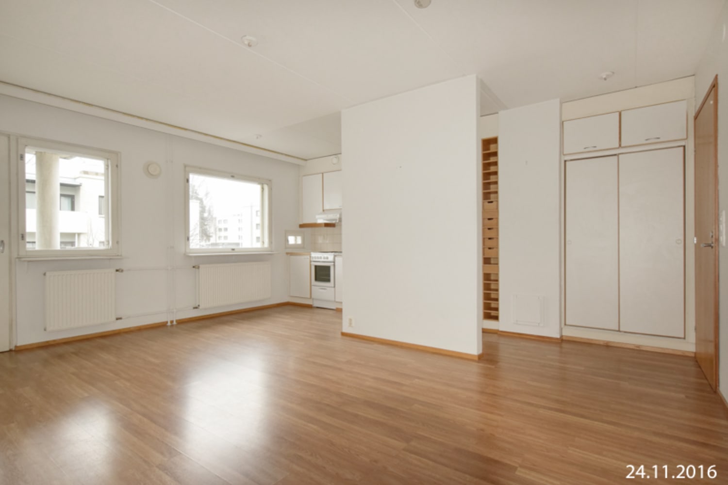 Asuinhuoneissa on laminaattilattiat ja kylpyhuone on kaakeloitu. Keittokomerossa on jää-pakastinkaappi ja nelilevyinen sähköliesi.