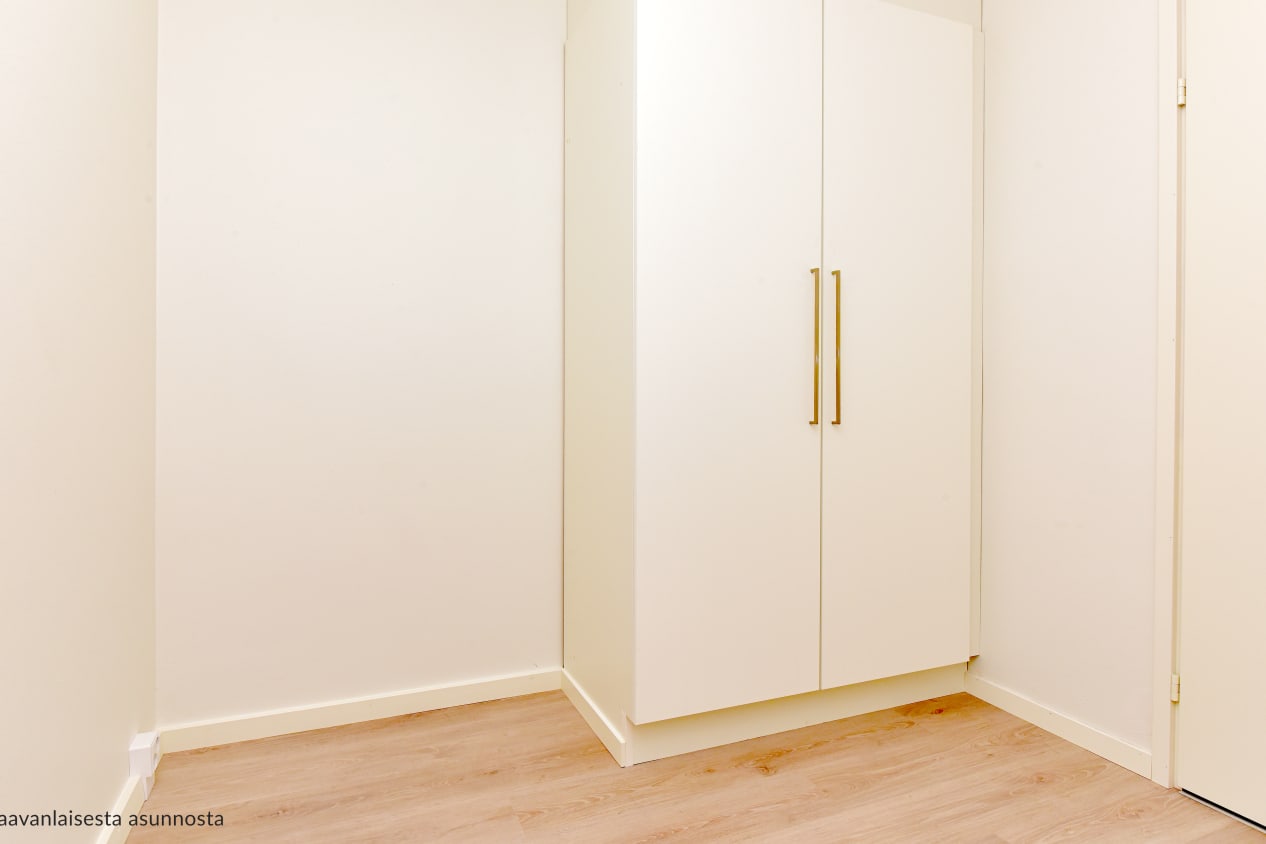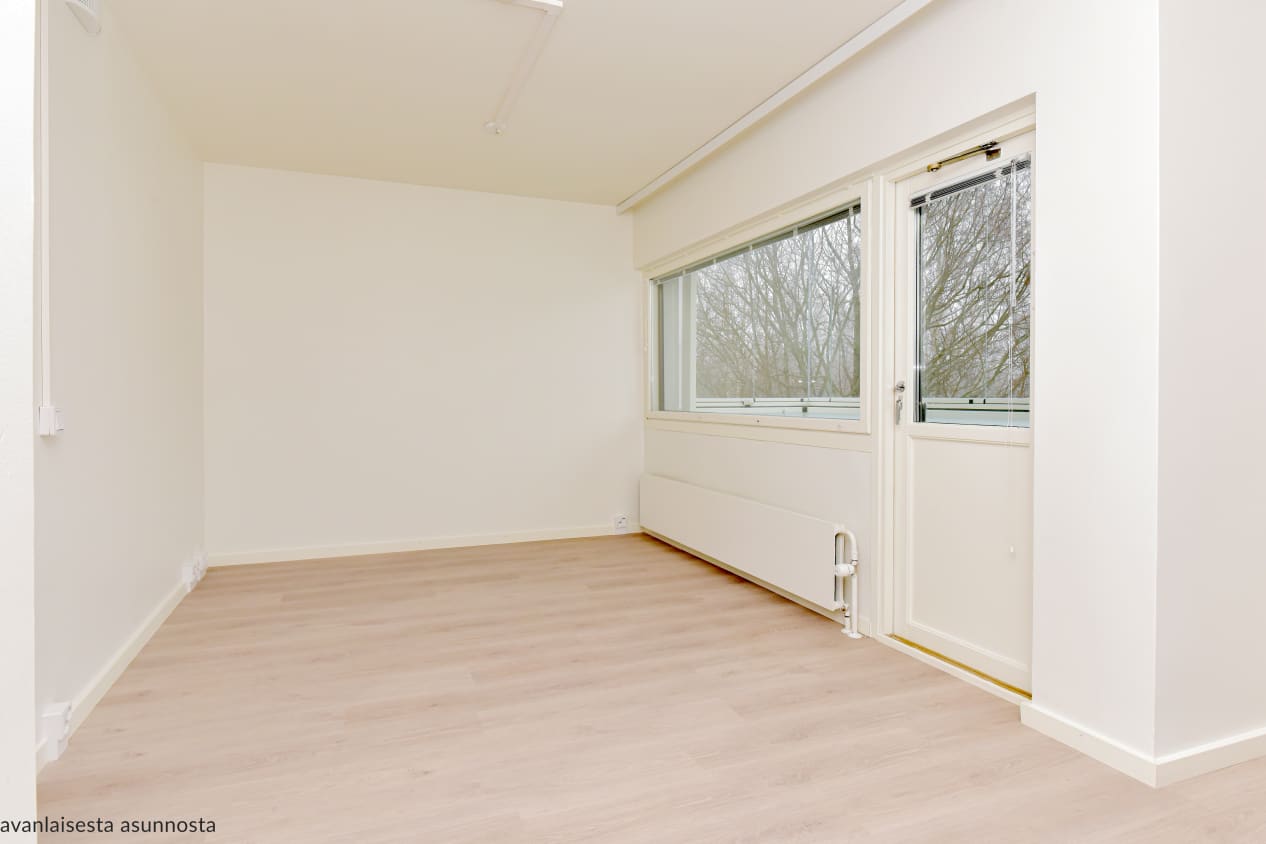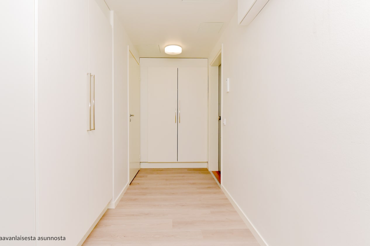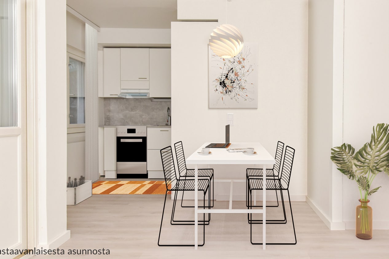 Kodin lattia on vaaleaa tammilaminaattia ja seinät on maalattu valkoisiksi. Olohuoneesta pääsee lasitetulle parvekkeelle. Tehokkaan keittiön kaapistot ovat raikkaan valkoiset ja ylä- ja alakaappien välinen tila sekä työtaso ovat harmaata laminaattia. Varustukseen kuuluu keraaminen liesi, liesikupu, jääkaappipakastin ja astianpesukone. Kodinkoneet ovat valkoisia.