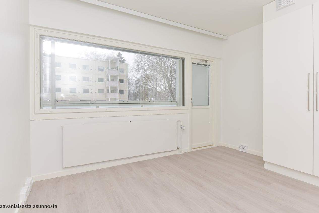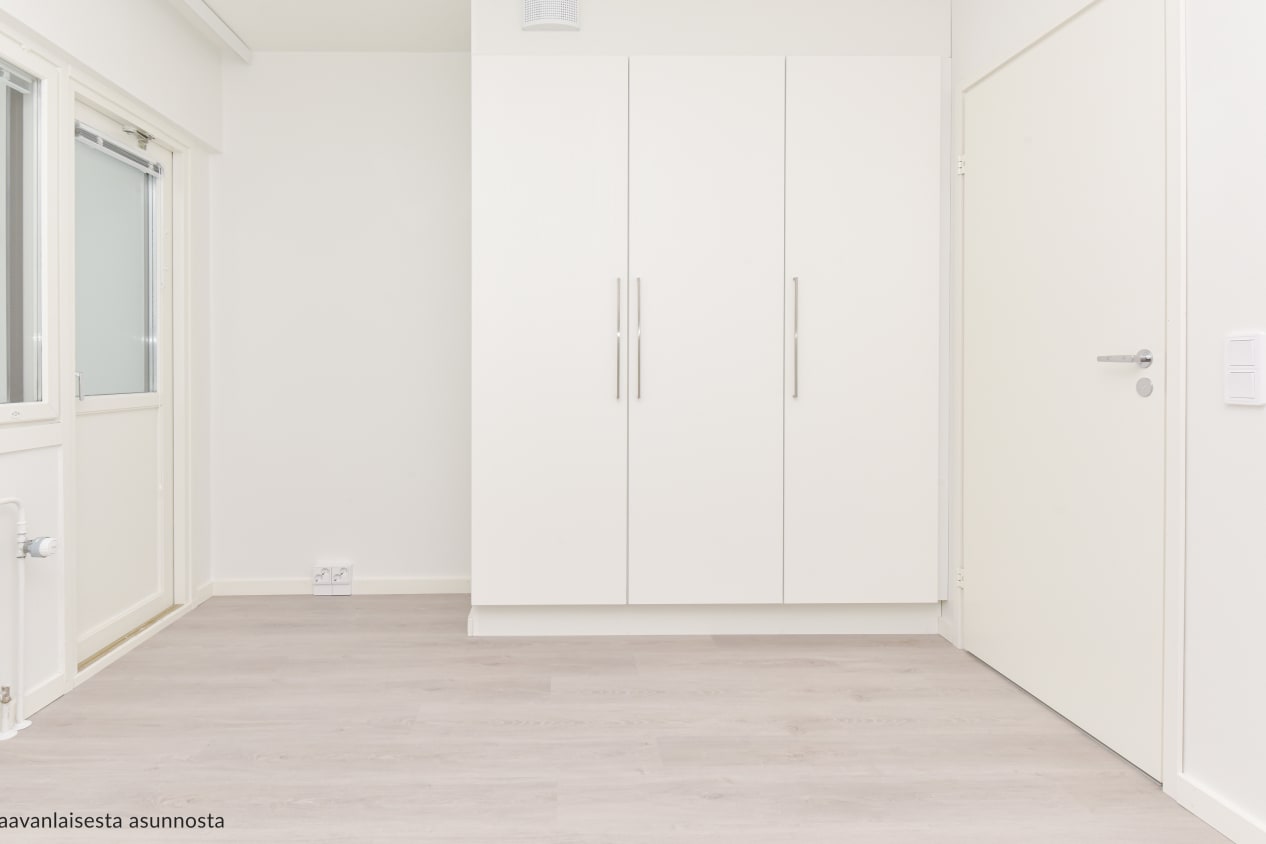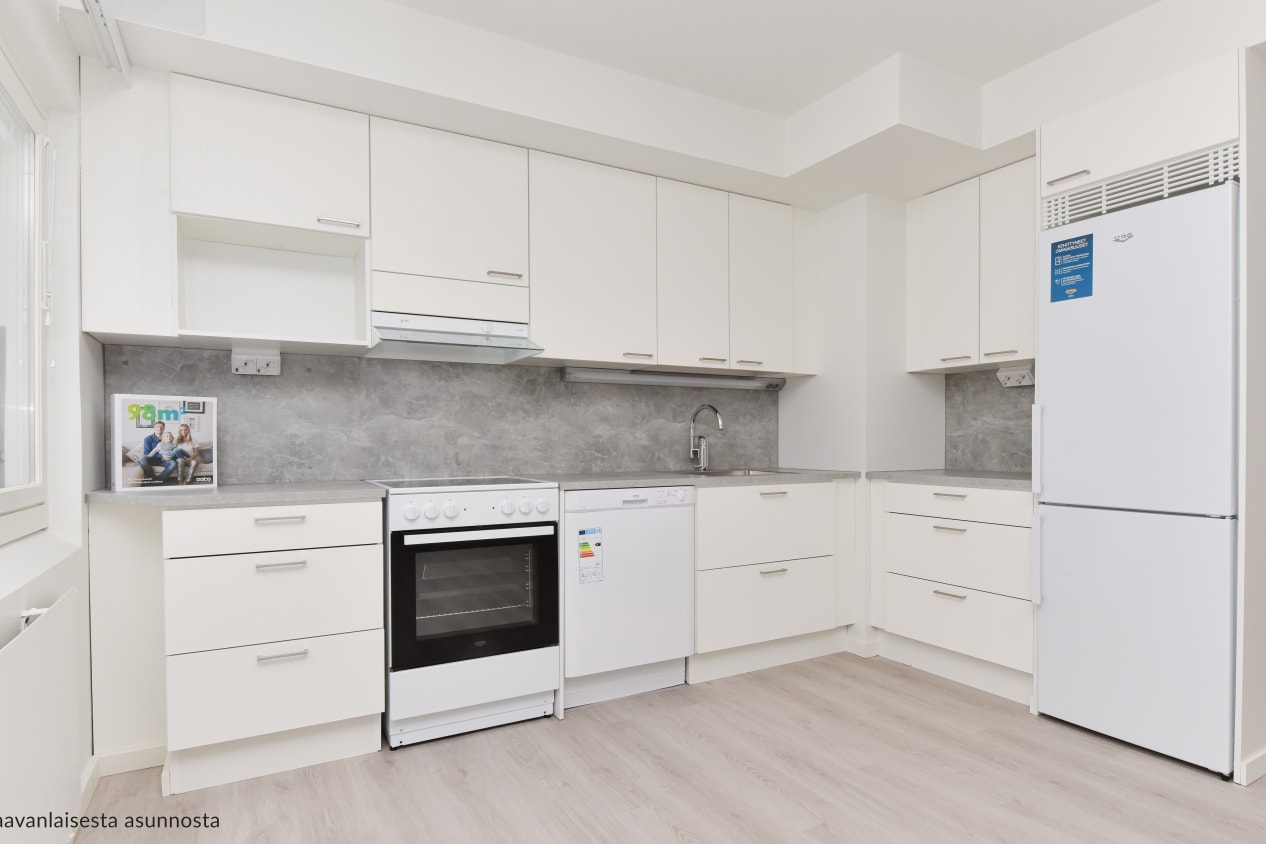 Elokuun alussa peruskorjauksesta valmistuvan avaranoloisen kaksion keittiö ja olohuone muodostavat valoisan oleskelualueen, jossa on ikkunat kahteen ilmansuuntaan. Makuuhuoneen jatkeena oleva lasitettu parveke on hyvä paikka kesäisille aamukahveille. Kodin pintamateriaalit ovat vaaleita ja pelkistetyn yksinkertaisia. Lattia ovat vaaleaa tammilaminaattia ja seinät on maalattu valkoisiksi. Linjakkaan avokeittiön kaapistot ovat valkoiset. Ylä- ja alakaappien välinen tila ja työtaso ovat harmaata laminaattia. Varustukseen kuuluu keraaminen liesi, liesikupu, jääkaappipakastin ja astianpesukone. Kodinkoneet ovat valkoisia. Kylpyhuoneessa on valkoiset SATOn Kide-malliston kalusteet ja paikka pyykinpesukoneelle. Seinät ovat valkoista laattaa ja lattia on harmaa. Eteisessä on tavallista runsaammin komerotilaa.