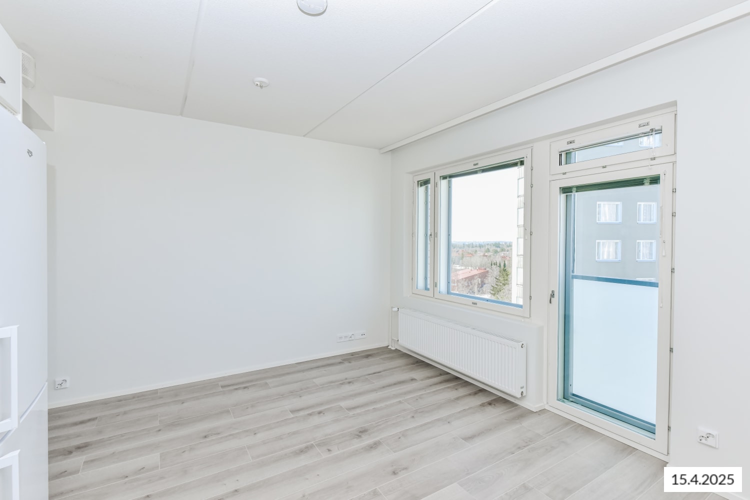 Moderni yksiö viehättää avoimella selkeydellään, johon valoa ja ilmavuutta tuo ranskalainen parveke. Kodin lattia on vaaleaa tammilaminaattia ja seinät on maalattu valkoisiksi. Ikkunassa on sälekaihtimet valmiina.