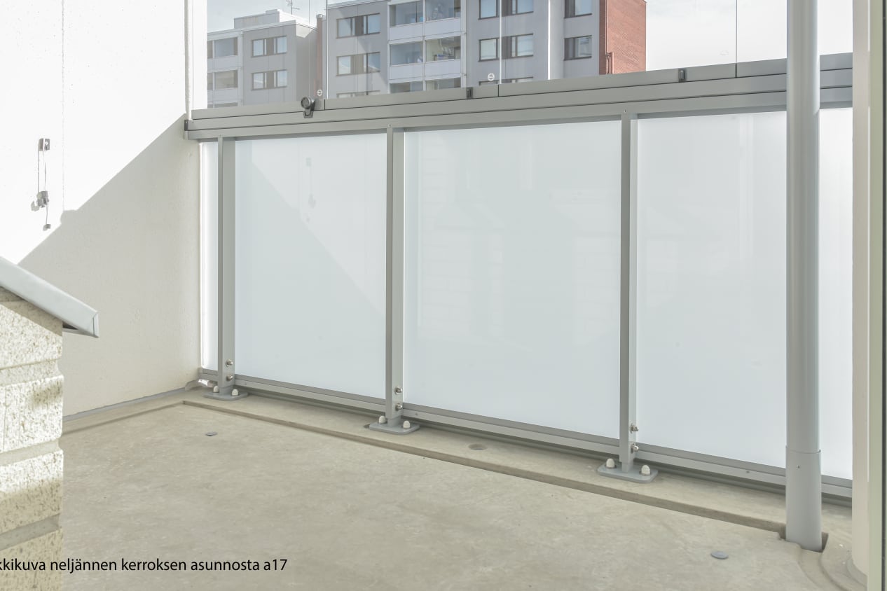 Vaaleasävyisen kulmahuoneiston avoin keittiö ja olohuone muodostavat ilmavan oleskelutilan, johon kahdesta suunnasta tuleva luonnonvalo luo tunnelmaa. Tilan jatkeena on lasitettu parveke, jossa on kesällä mukava nauttia aamukahvit.