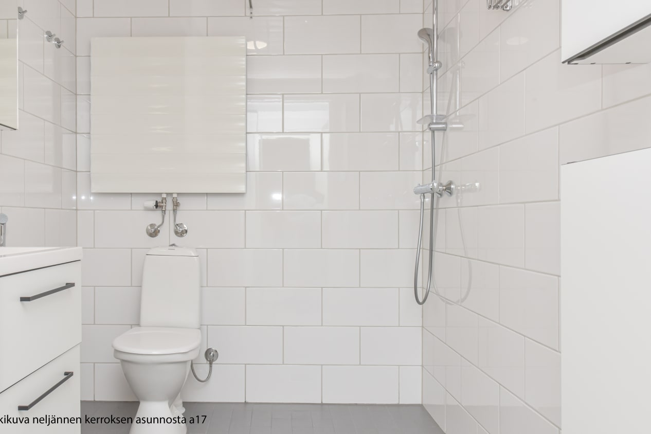 Kylpyhuoneessa on valkoiset Kide-malliston kotimaiset kalusteet. Seinät ovat isoa valkoista laattaa ja lattia on harmaa. Pesukoneelle ja kuivausrummulle on paikka ja seinällä on valmiina kokoon taittuva pyykkiteline. Sekä makuuhuoneessa että eteisessä on peililiukuovelliset kaapistot.