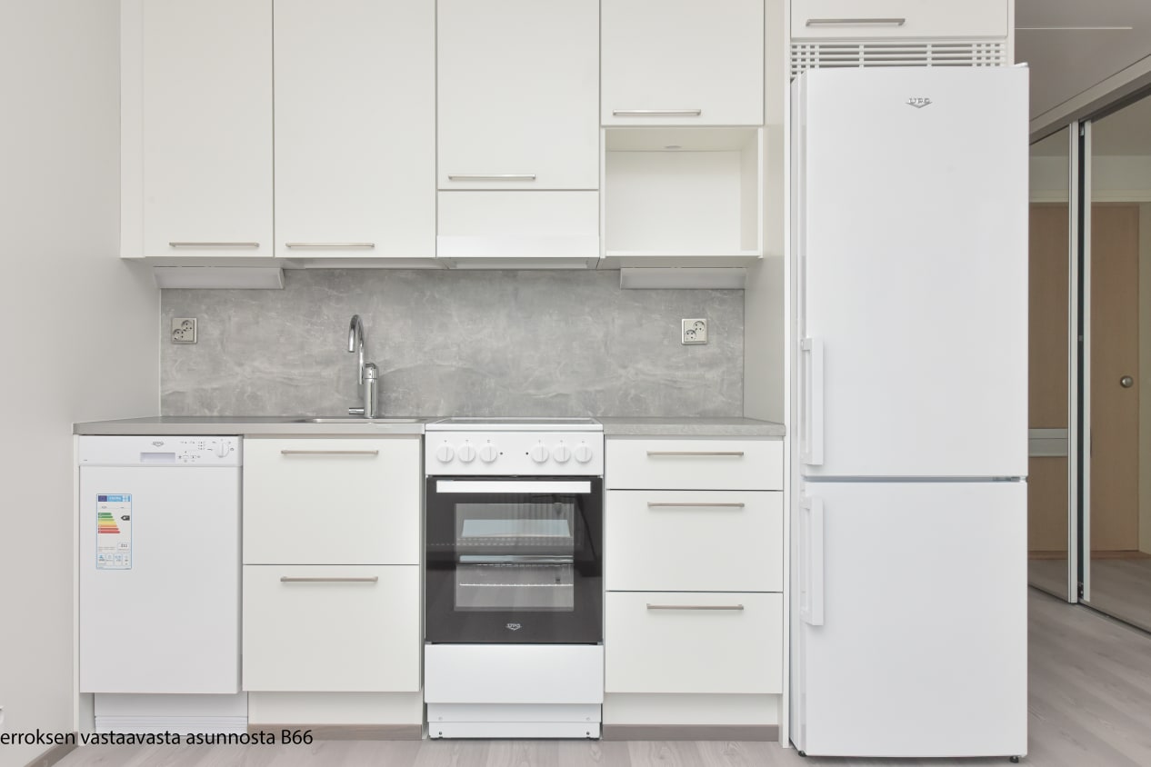 Upouuden kaksion avoin keittiö ja olohuone ovat yhtenäistä tilaa, ja niiden jatkeena on iltapäivän auringossa paistatteleva lasitettu parveke. Kodin lattia on vaaleaa tammilaminaattia ja seinät on maalattu valkoisiksi. Ikkunoissa on sälekaihtimet valmiina. Keittiöissä on valkoiset kaapistot ja erikoisuutena liikuteltavissa oleva saareke, jonka voit sijoittaa juuri omaan sisustukseesi sopivaan kohtaan. Ylä- ja alakaappien välinen tila ja työtaso ovat harmaata laminaattia. Varustukseen kuuluu astianpesukone, keraaminen liesi ja jääkaappipakastin. Kylpyhuoneessa on valkoiset SATOn Kide-malliston kalusteet. Seinät ovat isoa valkoista laattaa ja lattia on harmaa. Pesukoneelle ja kuivausrummulle on paikka ja seinällä on valmiina kokoontaittuva pyykkiteline. Sekä makuuhuoneessa että eteisessä on peililiukuovelliset kaapistot.