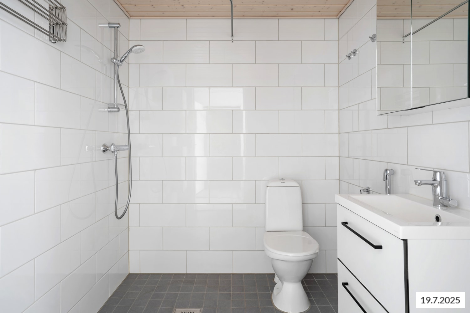 Kylpyhuoneessa on valkoiset Kide-malliston kotimaiset kalusteet. Seinät ovat isoa valkoista laattaa ja lattia on harmaa. Pesukoneelle ja kuivausrummulle on paikka ja seinällä on valmiina kokoontaittuva pyykkiteline. Eteisen kaapistossa on peililiukuovet.