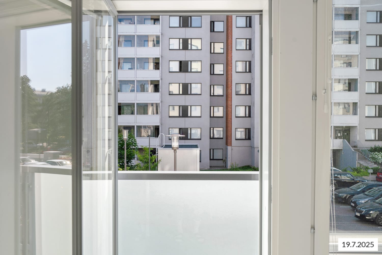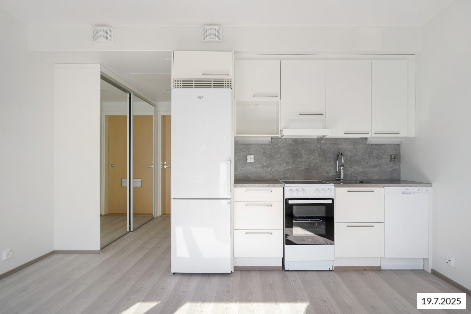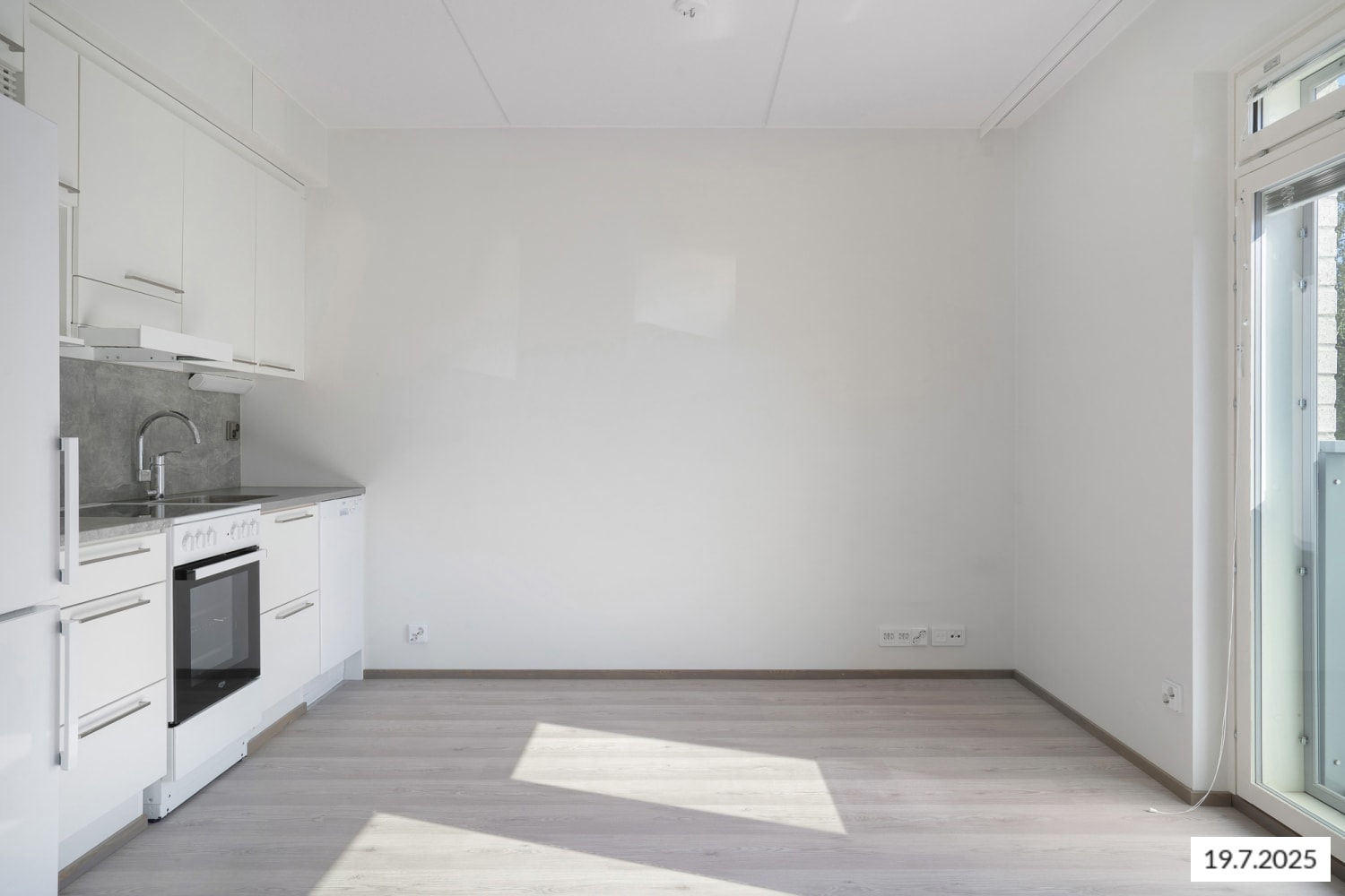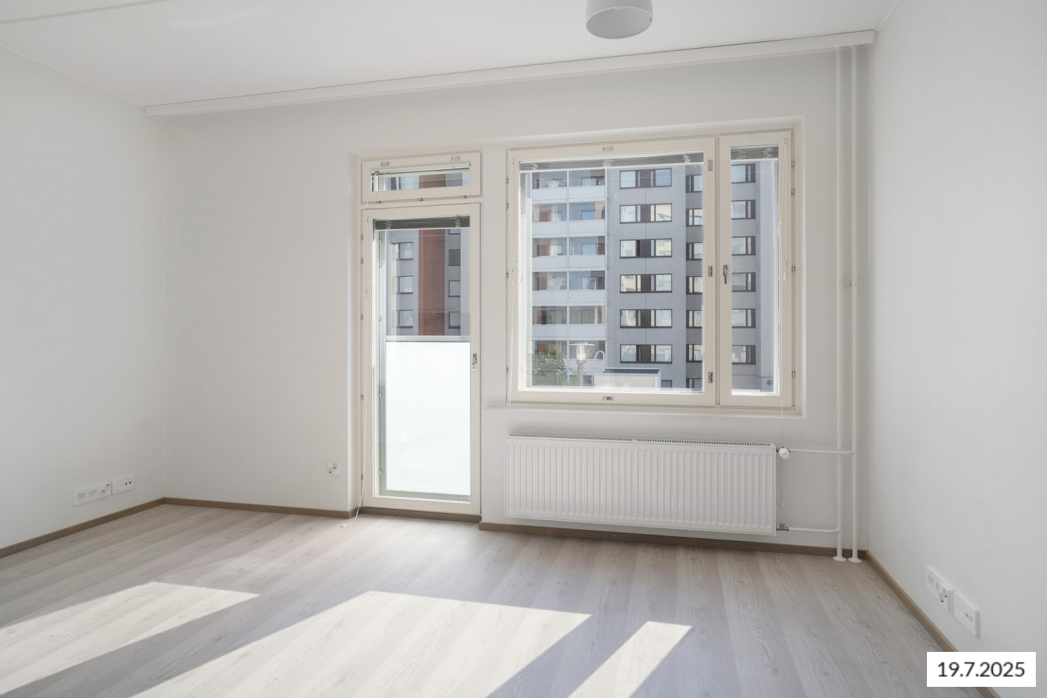 Nykyaikainen yksiö viehättää avoimella selkeydellään, johon valoa ja ilmavuutta tuo ranskalainen parveke. Kodin lattia on vaaleaa tammilaminaattia ja seinät on maalattu valkoisiksi. Ikkunassa on sälekaihtimet valmiina.