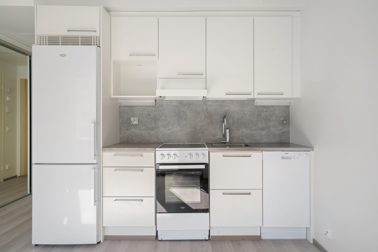 Keittiöissä on valkoiset kaapistot ja erikoisuutena liikuteltavissa oleva saareke, jonka voit sijoittaa juuri omaan sisustukseesi sopivaan kohtaan. Ylä- ja alakaappien välinen tila ja työtaso ovat harmaata laminaattia. Varustukseen kuuluu astianpesukone, keraaminen liesi ja jääkaappipakastin.