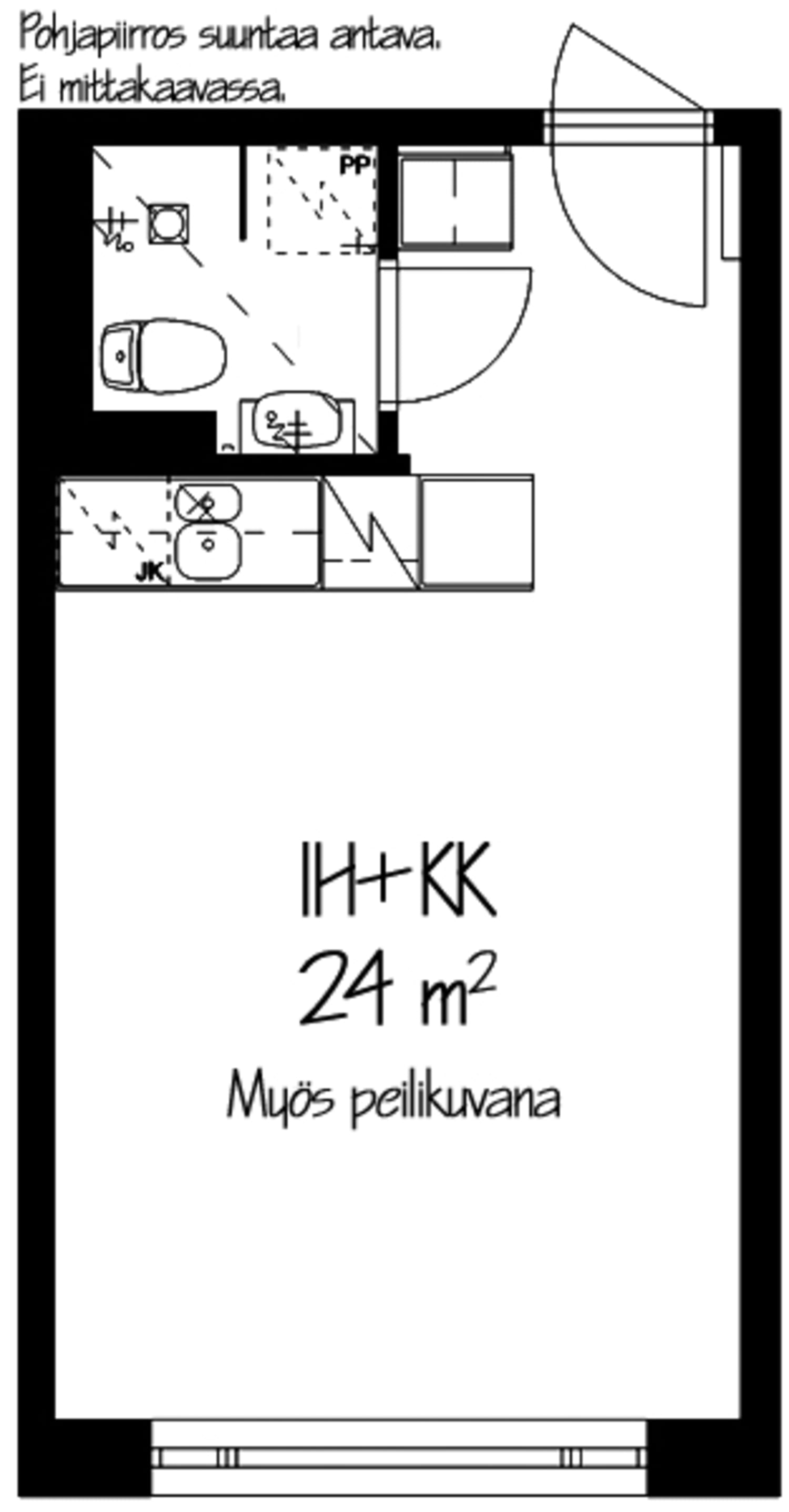 Rauhallinen ylimmän kerroksen pikkuyksiö viehättää valoisuudellaan. Asunnon vaaleat pintamateriaalit, valkoiset kalusteet ja iso ikkuna lisäävät tilan tuntua. Ikkunasta avautuu ainutlaatuinen näkymä pitkälle lounaaseen yli Pohjois-Haagan.