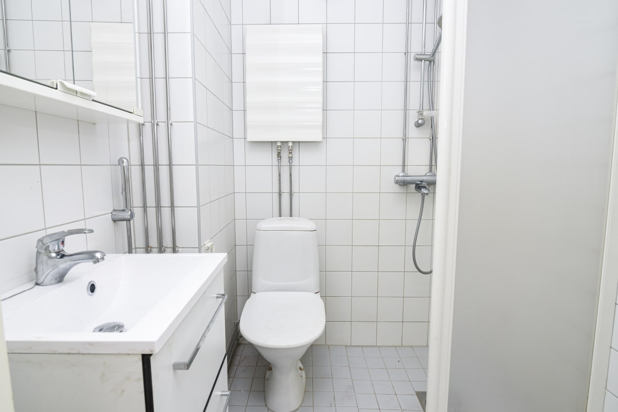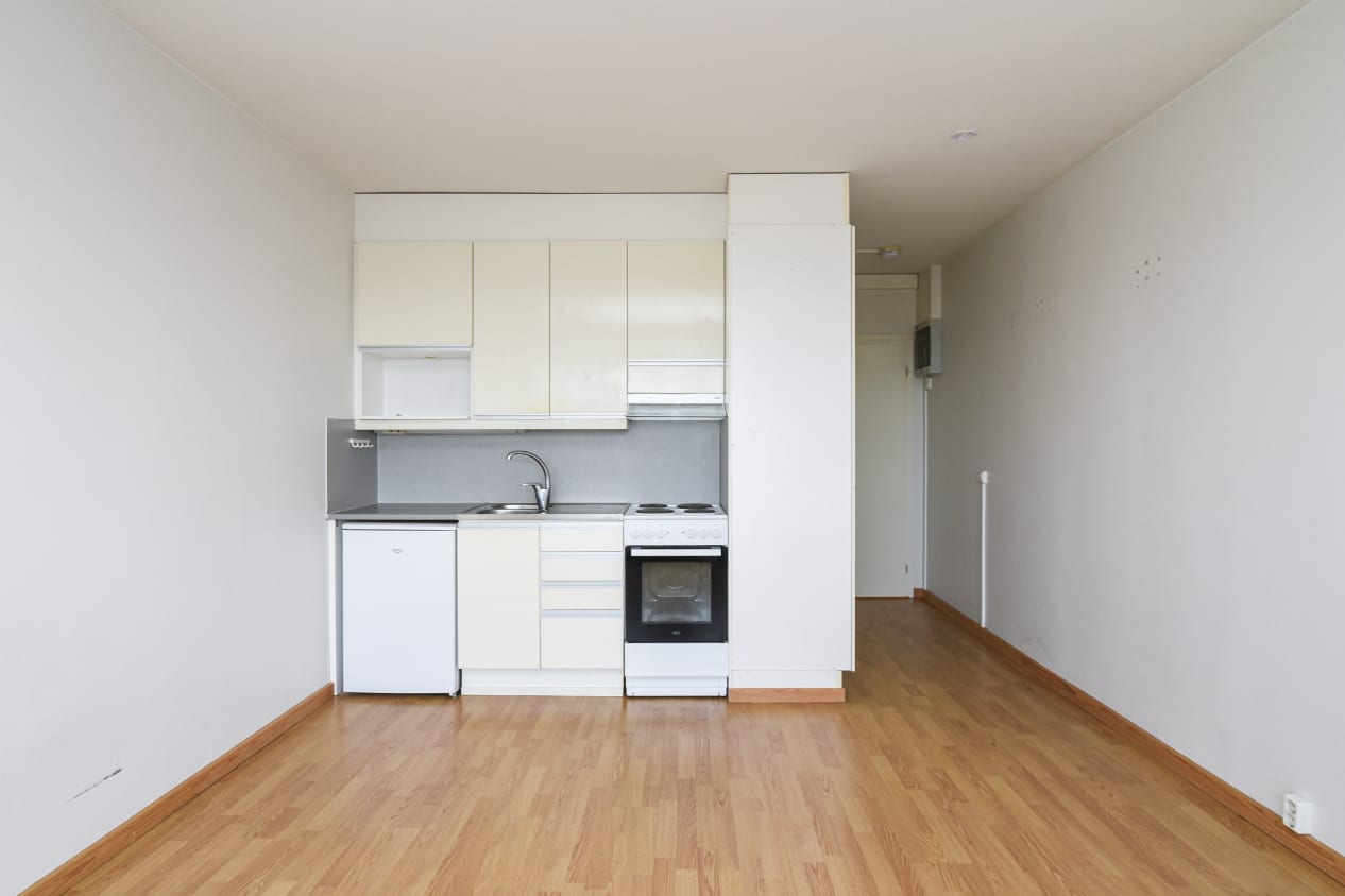 Asuinhuoneen lattia on tammilaminaattia. Kylpyhuoneessa on Kaakelikeskuksen tyylikkään tummanharmaat lattialaatat ja mattavalkoiset seinäkaakelit. Keittoseinäkkeessä on Upon valkoinen sähköliesi ja tehokas valkoinen pakastelokerollinen jääkaappi automaattisulatuksella. Keittoseinäkkeen kalustevälissä on helppohoitoinen harmaa laminaattipinta.