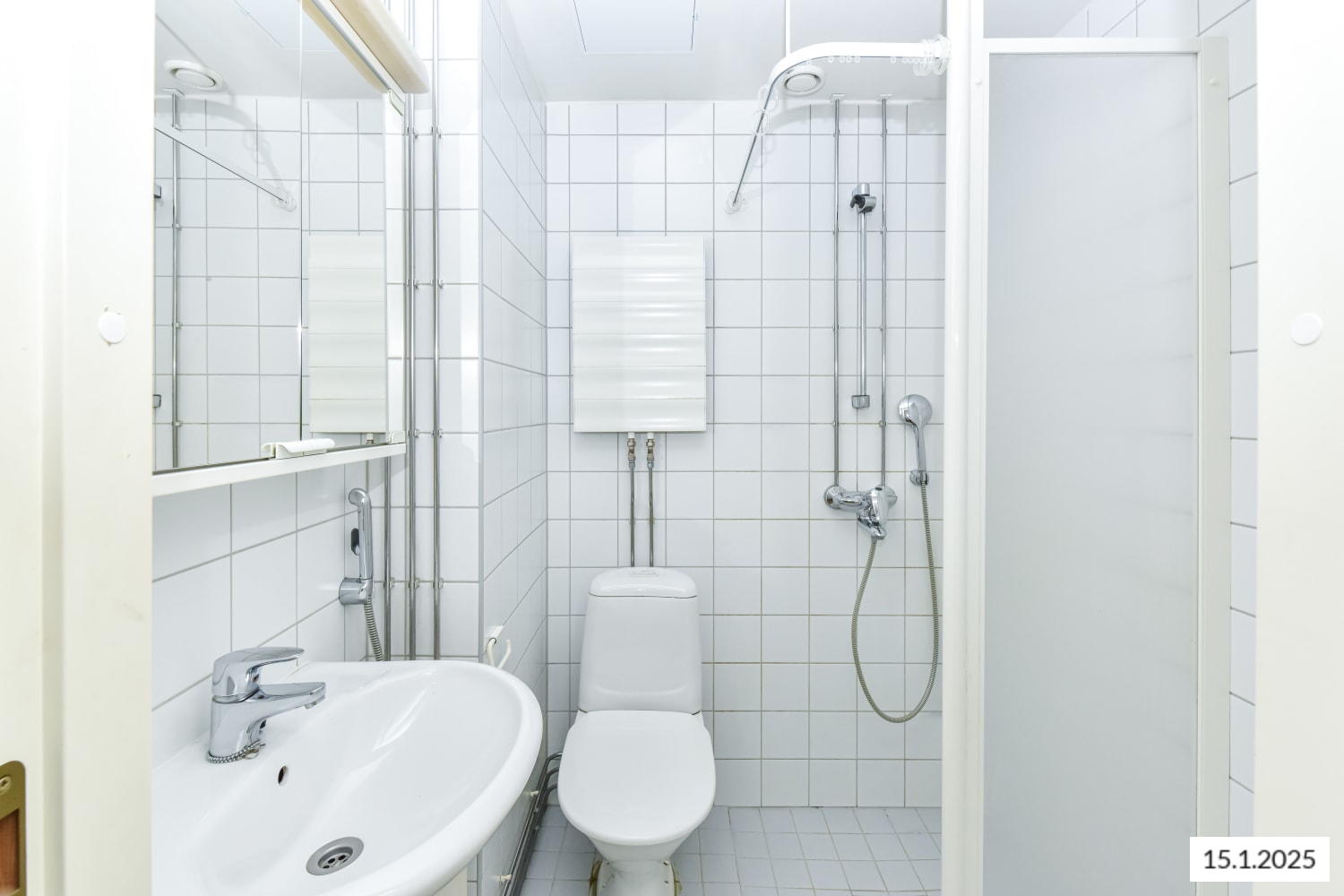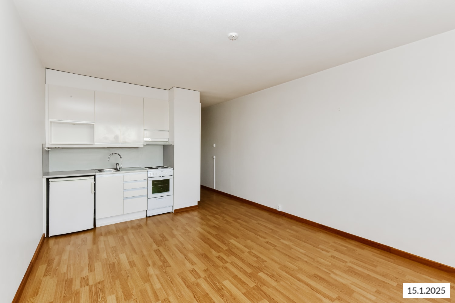 Asuinhuoneen lattia on helppohoitoista tammilaminaattia. Kylpyhuoneessa on Kaakelikeskuksen tyylikkään tummanharmaat lattialaatat ja mattavalkoiset seinäkaakelit. Keittoseinäkkeessä on Upon valkoinen sähköliesi ja tehokas valkoinen pakastelokerollinen jääkaappi automaattisulatuksella. Keittoseinäkkeen kalustevälissä on harmaa laminaattipinta.