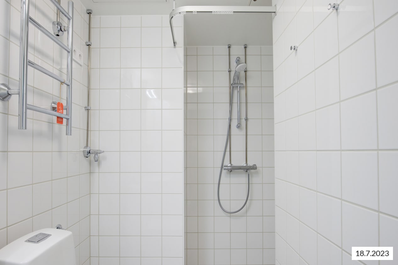 Raikkaassa kylpyhuoneessa on paikka ja liitännät pyykkikoneelle. Modernit, kotimaiset Kide-kylpyhuonekalusteet kestävät käytössä ja näyttävät hyvälle.