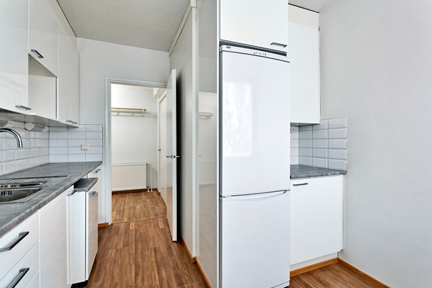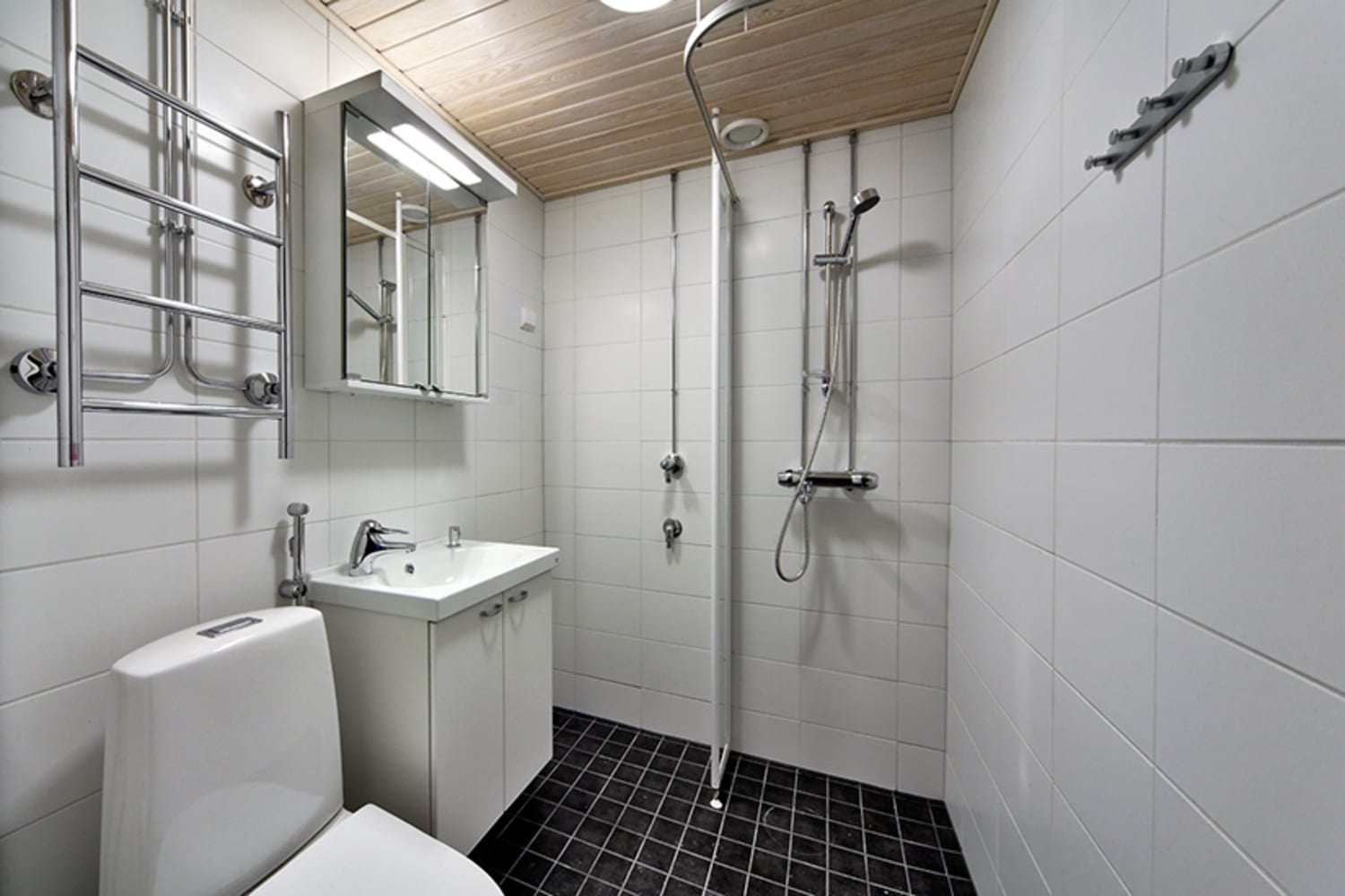 Asuinhuoneissa on helppohoitoiset ja kodin tunnelmaan sopivat tammilaminaattilattiat. Kylpyhuoneen lattiat on laatoitettu harmaalla ja seinät valkoisella kaakelilla. Valkoisissa keittiökaapistoissa on kaunis kiiltävä pinta ja työtasot ovat pehmeänharmaata laminaattia. Varusteina ovat jää-pakastinkaappi ja nelilevyinen sähköliesi.