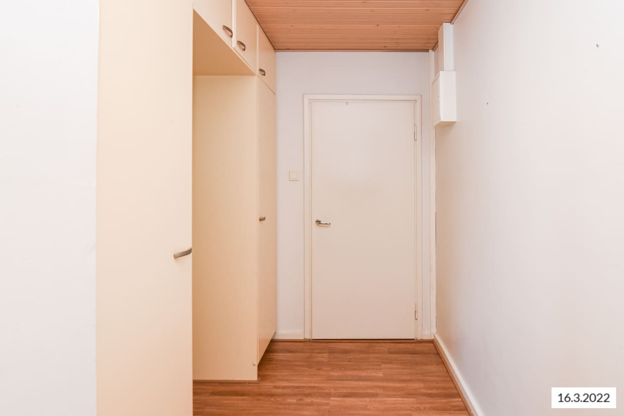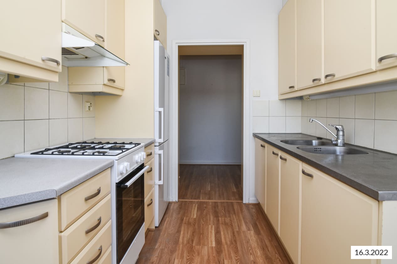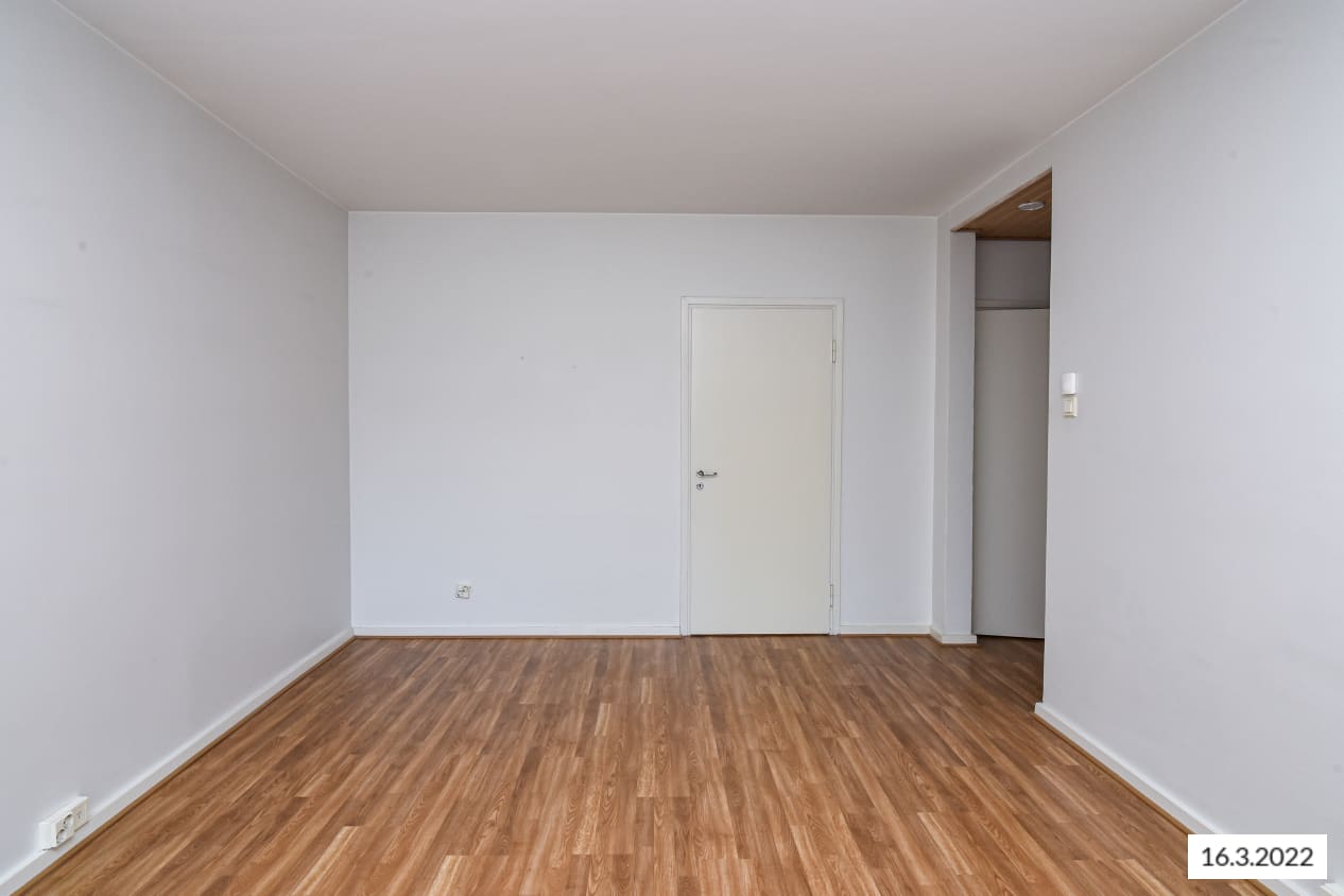 Huoneiston lattiamateriaalina on helppohoitoinen laminaatti. Siistissä kaakeloidussa kylpyhuoneessa on lattialämmitys. Kylpyhuoneeseen ei välttämättä mahdu pesukonetta, mutta taloyhtiössä on pesutupa kuivaushuoneineen. Keittiössä on jää-pakastinkaappi ja kaasuhella (kaasu kuuluu vuokraan).