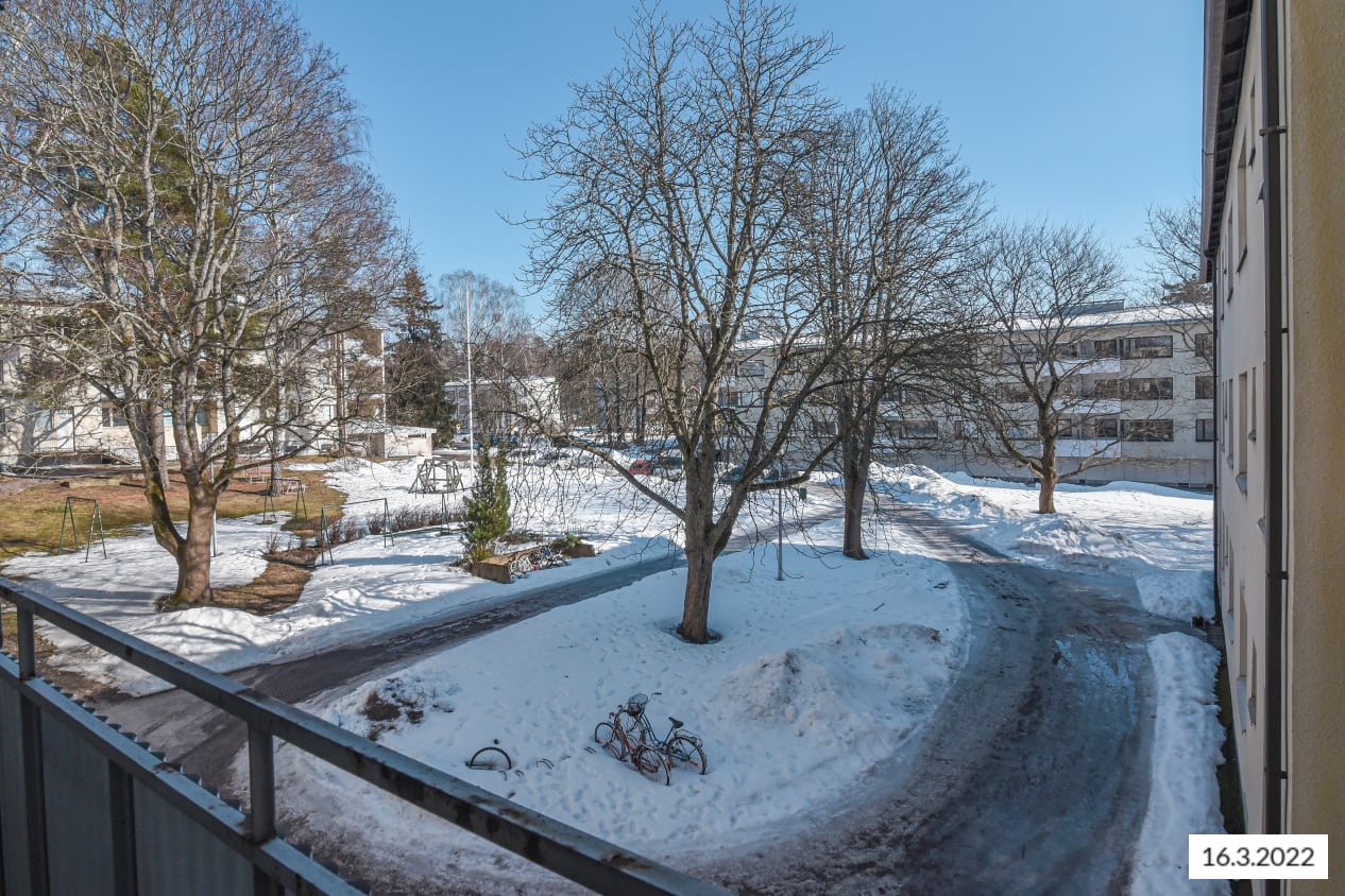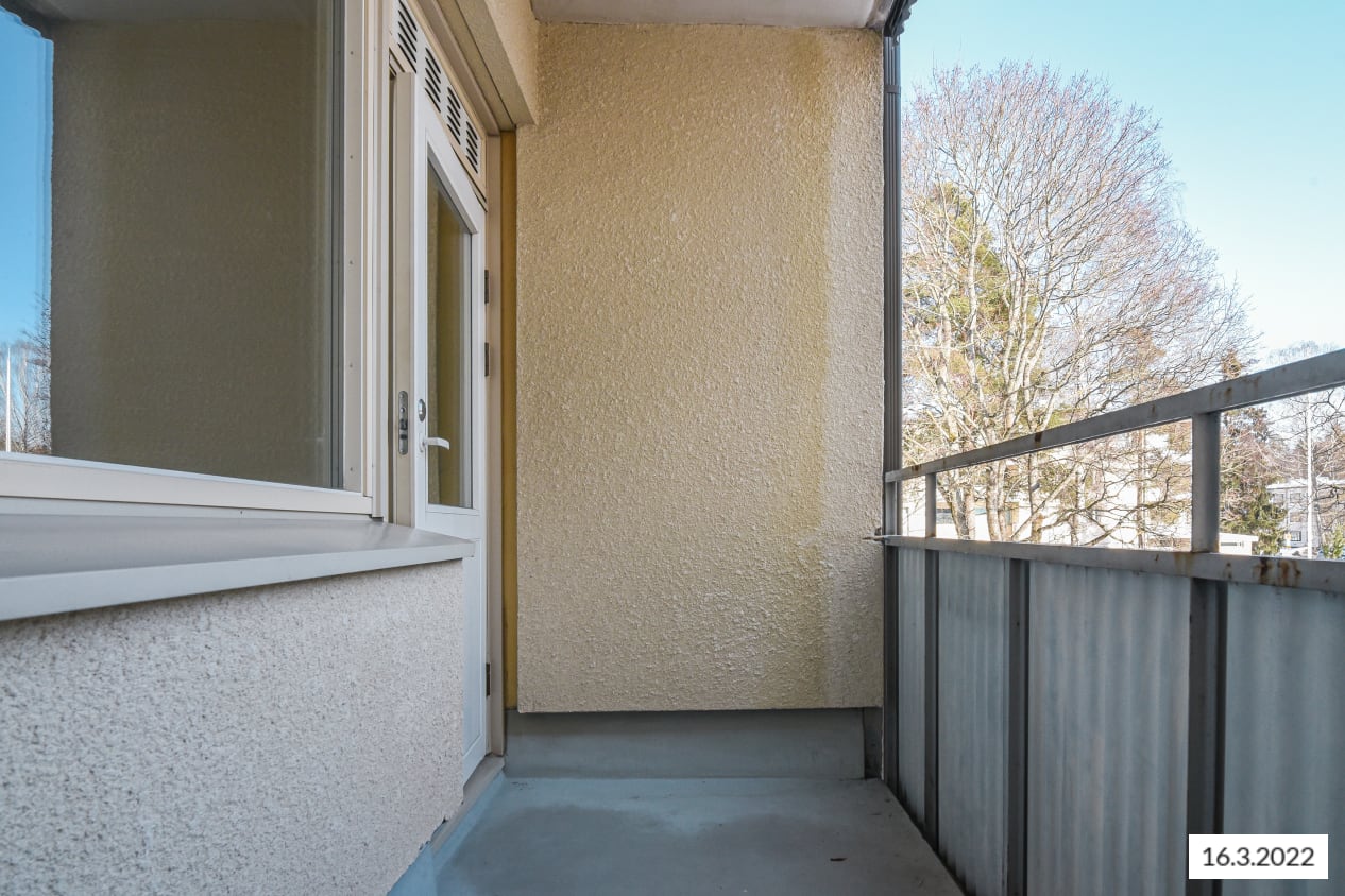Helposti sisustettava läpitalon kaksio ihastuttaa pihamaisemillaan ja etelään avautuvalla lasitetulla parvekkeellaan.