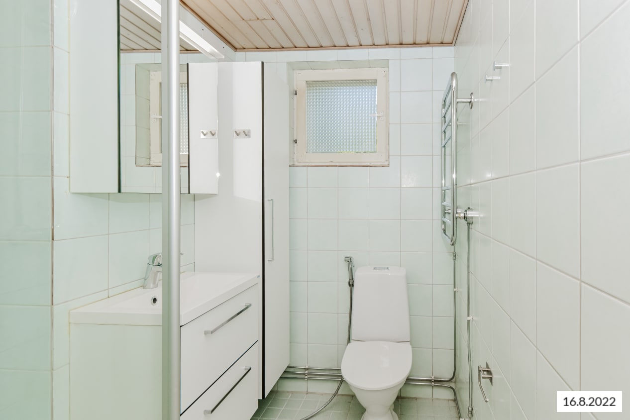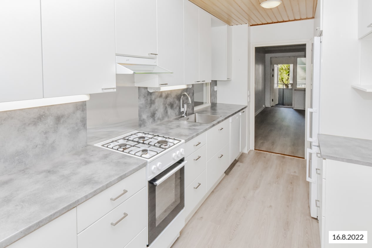 Keittiössä on jää-pakastinkaappi sekä kotikokin iloksi kaasuhella (kaasu sisältyy vuokraan).