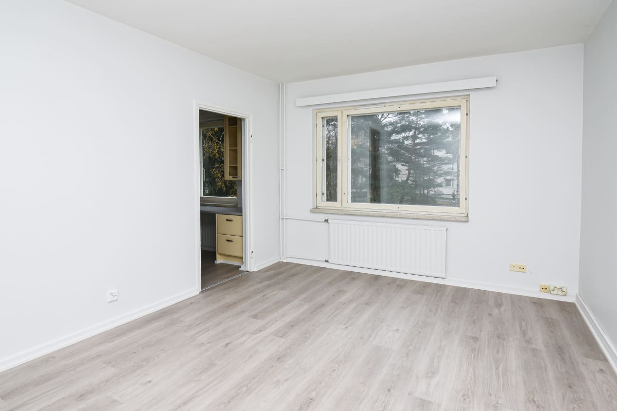 Valoisassa 1960-luvun kodissa on kauniit näkymät suojaisalle leikkipihalle. Huoneiston lattiat ovat helppohoitoista laminaattia.