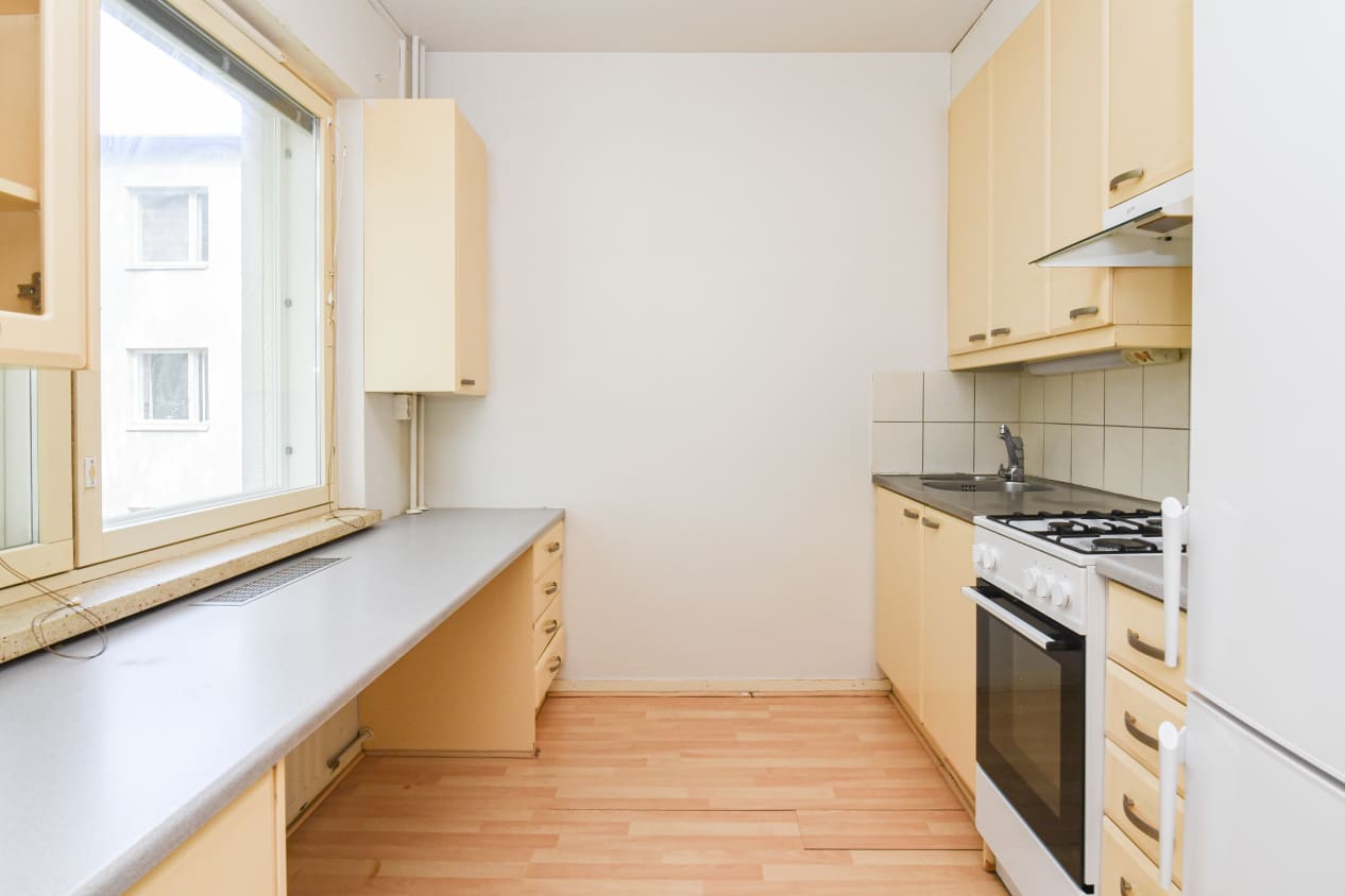Asuinhuoneiden lattiat ovat helppohoitoista laminaattia ja kylpyhuone on kaakeloitu. Keittokomerossa on jää-pakastinkaappi ja kotikokin riemuksi kaasuliesi (kaasu sisältyy vuokraan).