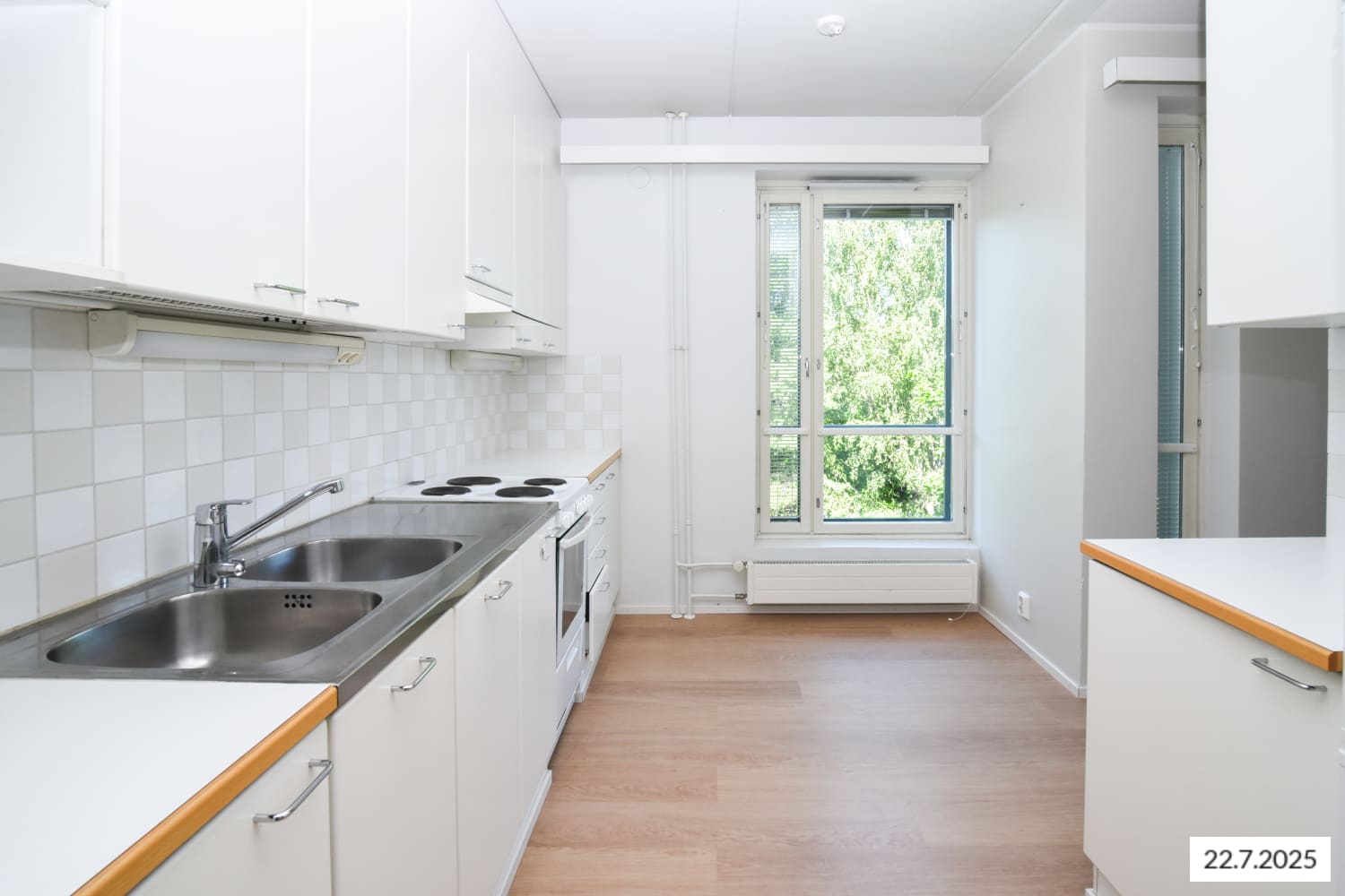 Keittiössä on jää-pakastinkaappi ja nelilevyinen sähköliesi sekä varauas astianpesukoneelle.