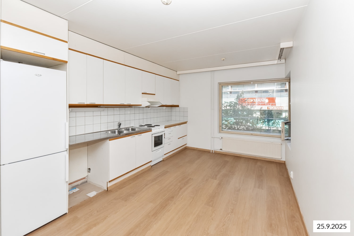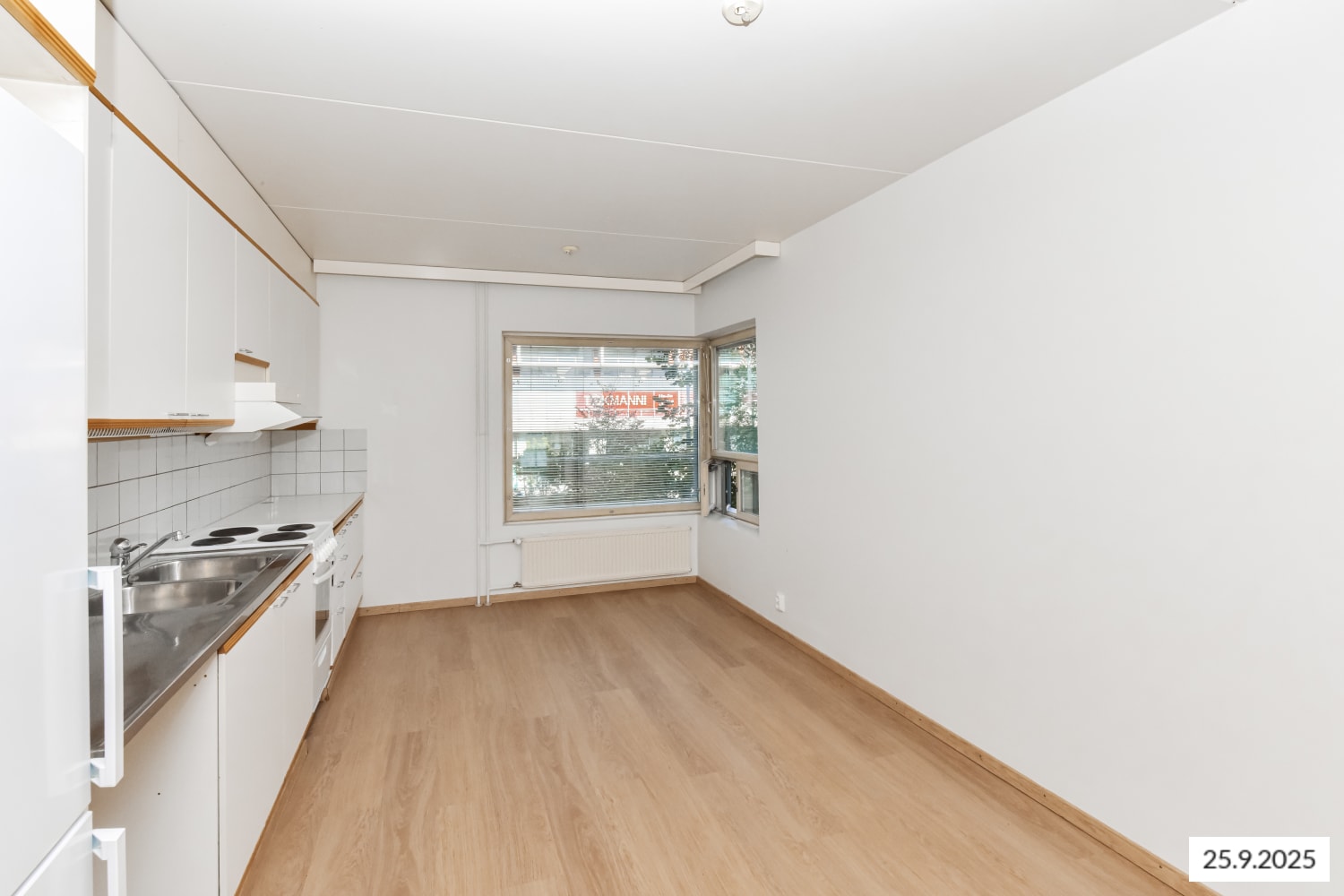 Asuinhuoneiden lattiamateriaalina on laminaatti. Eteisestä on käynti keittiöön, jossa kotikokki mahtuu puuhailemaan ja sinne mahtuu myös ruokapöytä viihtyisästi ikkunan ääreen. Keittiön varustukseen kuuluu perinteinen liesi, liesikupu, jääkaappipakastin ja astianpesukone.