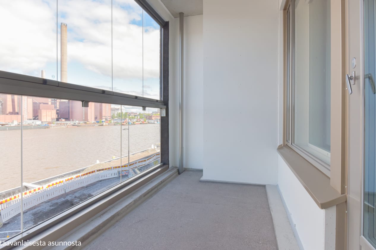 Syksyllä 2021 valmistunut yksiö on selkeä ja valoisa. Keittiö ja olohuone yhdistyvät avoimeksi oleskelutilaksi, jonka jatkeena on koko asunnon levyinen lasitettu parveke Sompasaarenaltaan puolelle. Kodin pintamateriaalit ovat vaaleita ja pelkistetyn yksinkertaisia. Lattiat ovat vaaleaa tammilaminaattia ja seinät on maalattu valkoisiksi. Linjakkaan avokeittiön kaapistot ovat valkoiset ja laminaattityötaso on harmaa. Ylä- ja alakaappien välinen tila on komposiittilevyä, jonka sävy on harjattu alumiini. Varustukseen kuuluu keraaminen liesi, liesikupu, astianpesukone ja jääkaappipakastin. Kodinkoneet ovat valkoiset. Kylpyhuoneessa on valkoiset SATOn Kide-malliston kalusteet ja paikka pyykinpesukoneelle. Seinät ovat valkoista laattaa ja lattia on harmaa.
