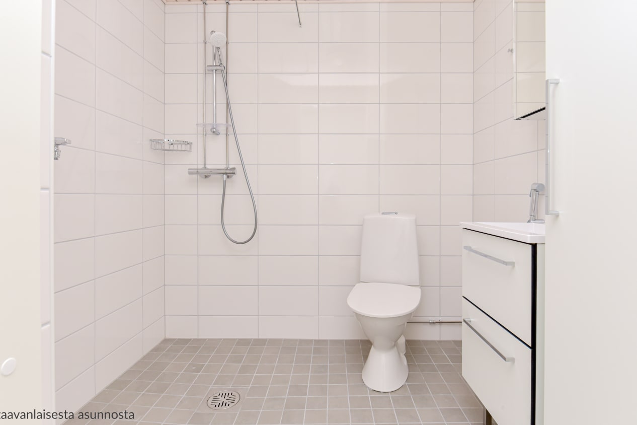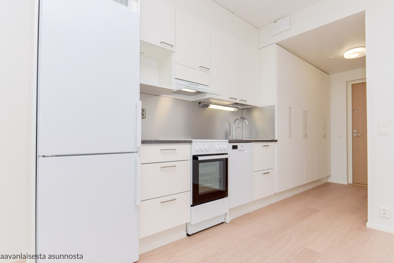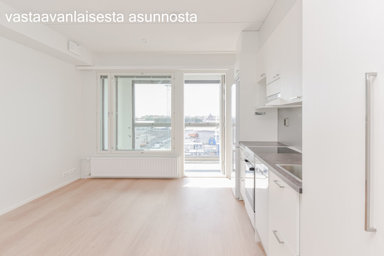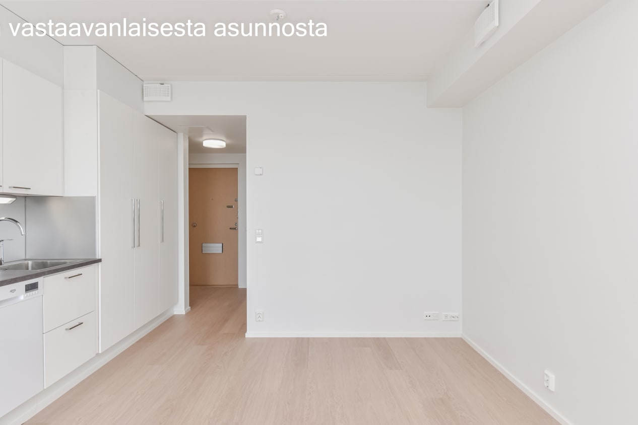 Syksyllä 2021 valmistunut yksiö on selkeä ja valoisa. Keittiö ja olohuone yhdistyvät avoimeksi oleskelutilaksi, jonka jatkeena on koko asunnon levyinen lasitettu parveke Nihdinkanavan puolelle. Kodin pintamateriaalit ovat vaaleita ja pelkistetyn yksinkertaisia. Lattiat ovat vaaleaa tammilaminaattia ja seinät on maalattu valkoisiksi. Linjakkaan avokeittiön kaapistot ovat valkoiset ja laminaattityötaso on harmaa. Ylä- ja alakaappien välinen tila on komposiittilevyä, jonka sävy on harjattu alumiini. Varustukseen kuuluu keraaminen liesi, liesikupu, astianpesukone ja jääkaappipakastin. Kodinkoneet ovat valkoiset. Kylpyhuoneessa on valkoiset SATOn Kide-malliston kalusteet ja paikka pyykinpesukoneelle. Seinät ovat valkoista laattaa ja lattia on harmaa.