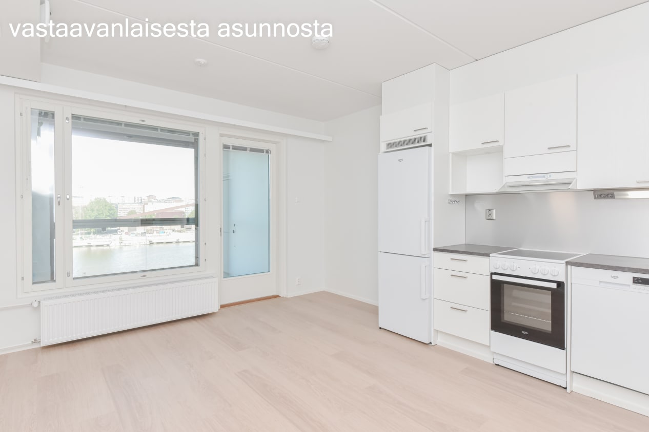 Syksyllä 2021 valmistunut yksiö on selkeä ja valoisa. Keittiö ja olohuone yhdistyvät avoimeksi oleskelutilaksi, jonka jatkeena on koko asunnon levyinen lasitettu parveke Sompasaarenaltaan puolelle. Kodin pintamateriaalit ovat vaaleita ja pelkistetyn yksinkertaisia. Lattiat ovat vaaleaa tammilaminaattia ja seinät on maalattu valkoisiksi. Linjakkaan avokeittiön kaapistot ovat valkoiset ja laminaattityötaso on harmaa. Ylä- ja alakaappien välinen tila on komposiittilevyä, jonka sävy on harjattu alumiini. Varustukseen kuuluu keraaminen liesi, liesikupu, astianpesukone ja jääkaappipakastin. Kodinkoneet ovat valkoiset. Kylpyhuoneessa on valkoiset SATOn Kide-malliston kalusteet ja paikka pyykinpesukoneelle. Seinät ovat valkoista laattaa ja lattia on harmaa.