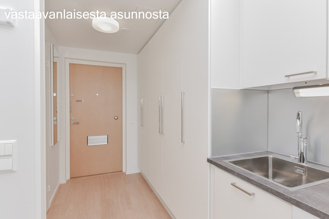 Syksyllä 2021 valmistunut yksiö on selkeä ja valoisa. Keittiö ja olohuone yhdistyvät avoimeksi oleskelutilaksi, jonka jatkeena on koko asunnon levyinen lasitettu parveke Nihdinkanavan puolelle. Kodin pintamateriaalit ovat vaaleita ja pelkistetyn yksinkertaisia. Lattiat ovat vaaleaa tammilaminaattia ja seinät on maalattu valkoisiksi. Linjakkaan avokeittiön kaapistot ovat valkoiset ja laminaattityötaso on harmaa. Ylä- ja alakaappien välinen tila on komposiittilevyä, jonka sävy on harjattu alumiini. Varustukseen kuuluu keraaminen liesi, liesikupu, astianpesukone ja jääkaappipakastin. Kodinkoneet ovat valkoiset. Kylpyhuoneessa on valkoiset SATOn Kide-malliston kalusteet ja paikka pyykinpesukoneelle. Seinät ovat valkoista laattaa ja lattia on harmaa.