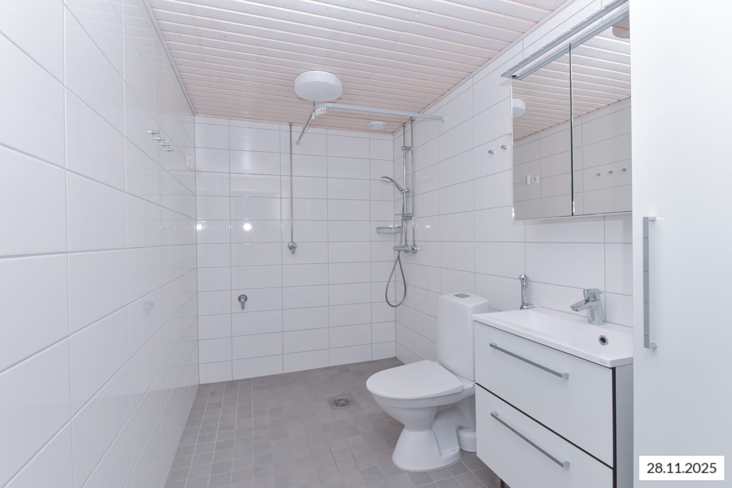 Kylpyhuoneessa on valkoiset Kide-malliston kotimaiset kalusteet ja paikka pyykinpesukoneelle. Seinät ovat valkoista laattaa ja lattia on harmaa. Erillisestä vaatehuoneesta löytyy mukavasti tilaa säilytykselle.