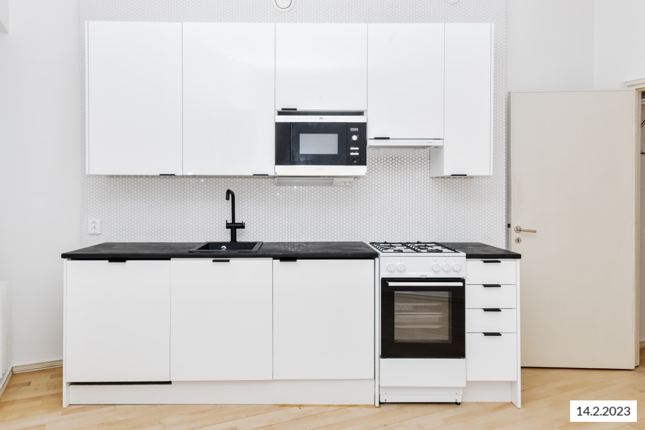 Asuinhuoneiden lattiamateriaalina on parketti. Kaakeloidussa kylpyhuoneessa on pesukoneliitäntä. Keittiössä on jääkaappi ja kaasuliesi (kaasu ei sisälly vuokraan).