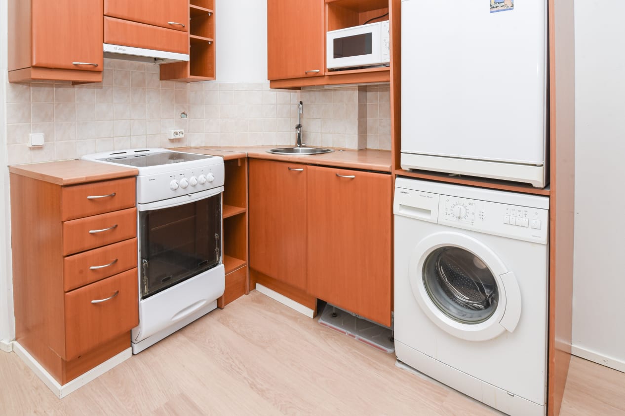 Asuinhuoneen lattiat ovat laminaattia. Kylpyhuone on kokonaisuudessaan kaakeloitu. Keittokulmauksessa on keraaminen liesi sekä jääkaappi ja astianpesukone.