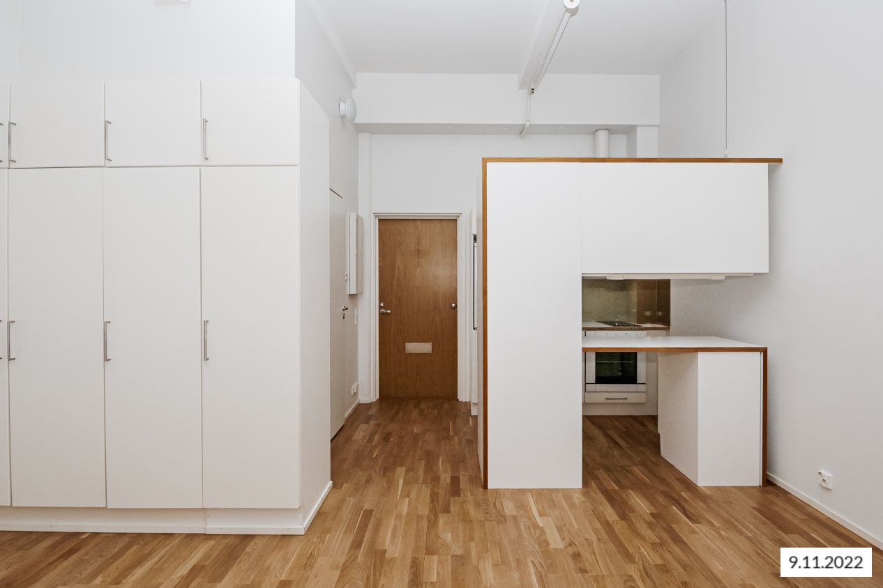 Asunnon lattiat ovat kaunista himmeälakattua tammilautaparkettia ja mukavuuslattialämmitetty kylpyhuone on kauttaaltaan kaakeloitu. Keittokomeroon tuo oman tunnelmansa kalustevälien persoonallinen taustamaalattu lasipinta. Asunnon vakiovarusteisiin kuuluvat jääkaappi sekä kaksilevyinen keraaminen liesi uuneineen.