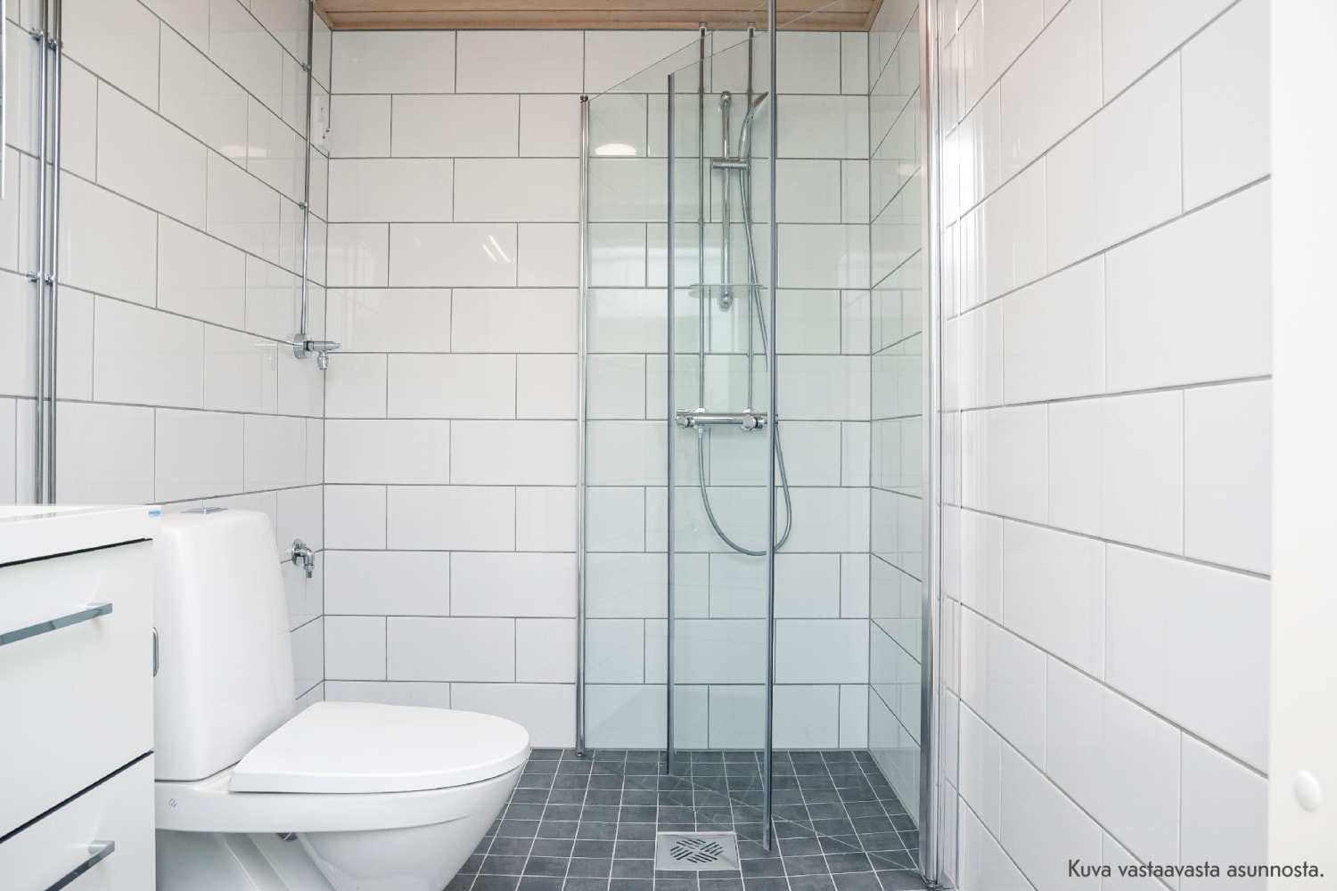 Lattiat ovat vaaleaa tammilaminaattia ja seinät on maalattu valkoisiksi. Keittiön kaapistojen ovet ovat valkoiset ja ylä- ja alakaappien välinen tila ja työtaso ovat harmaata laminaattia. Kodinkoneet ovat keittiökalusteisiin integroituja. Tyylikkäät kylpyhuoneen kalusteet ovat valkoista massiivilaminaattia. Seinät ovat tiililadottua valkoista laattaa ja lattian laatoituksen sävy on harmaa. Pesukoneelle ja kuivausrummulle on paikka. Kaikki kaapistot ja komerokalusteet ovat kotimaista Kankarin Kalusteen tuotantoa.