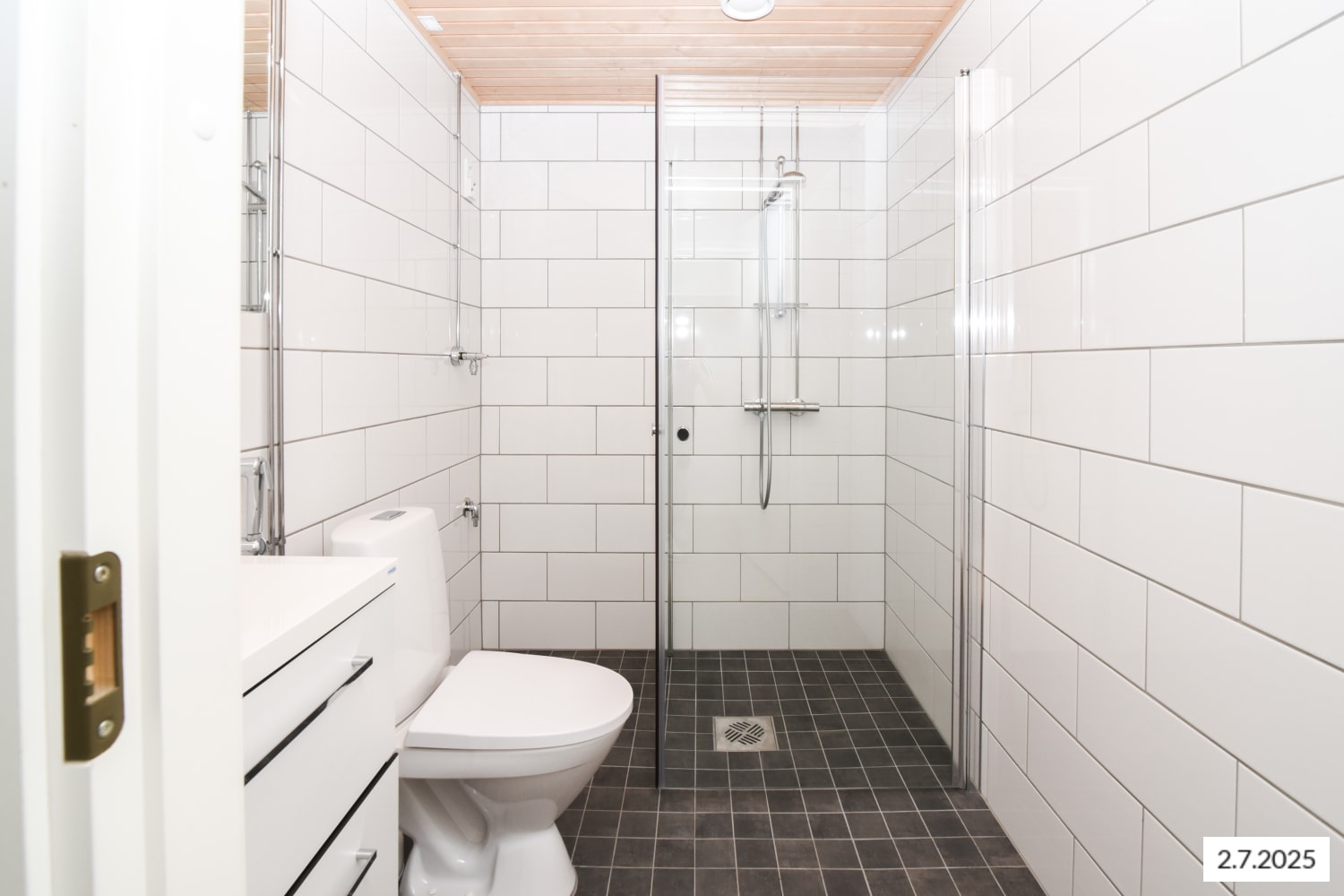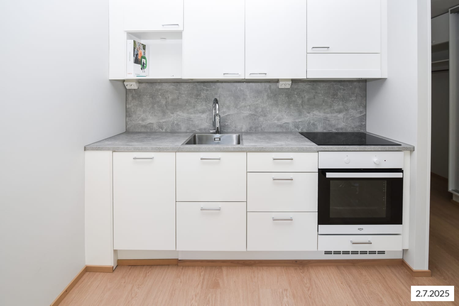 Keittiössä on kaikki tarvittavat mukavuudet: astianpesukone, induktioliesi ja jääkaappi-pakastin, mikrollekin on paikka valmiina. Kotimaiset Kide-malliston kalusteet tuovat kylpyhuoneeseen kestävää toiminnallisuutta, ja pesukoneelle on liitäntävalmius.
