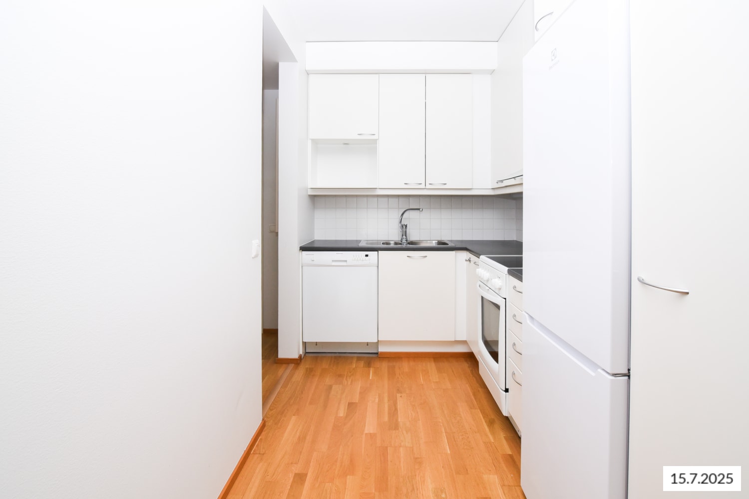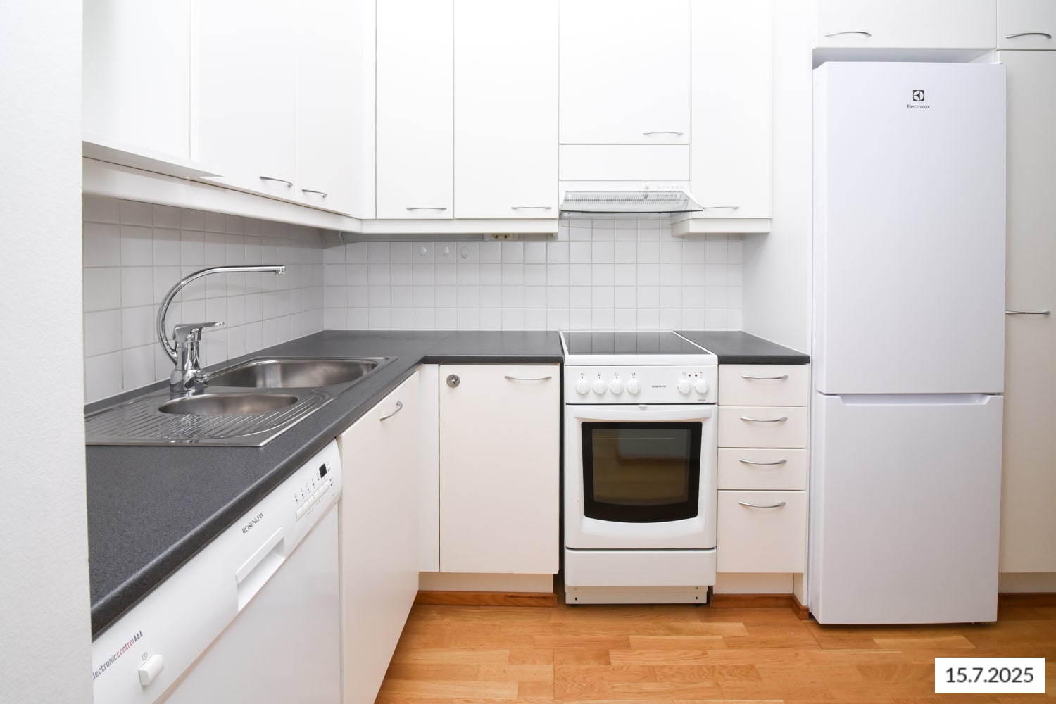 Vaaleasävyinen keittiö on varustettu astianpesukoneella, keraamisella liedellä ja jää-pakastinkaapilla. Keittiökaappien välinen tila on laatoitettu valkoisella.