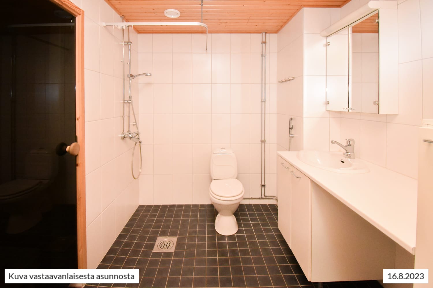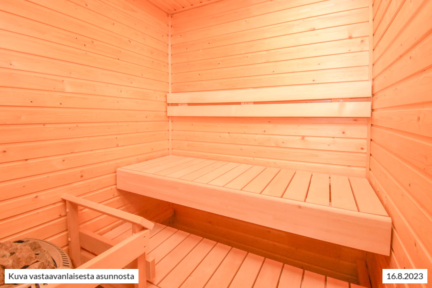 Tilavassa kylpyhuoneessa mahtuu peseytymään ja kätevän tason ansiosta myös pyykkihuolto on helppoa. Pyykinpesukoneelle on tilavaraus. Kodin kruunaa oma sauna, jossa on mukava rentouta pitkän päivän päätteeksi.