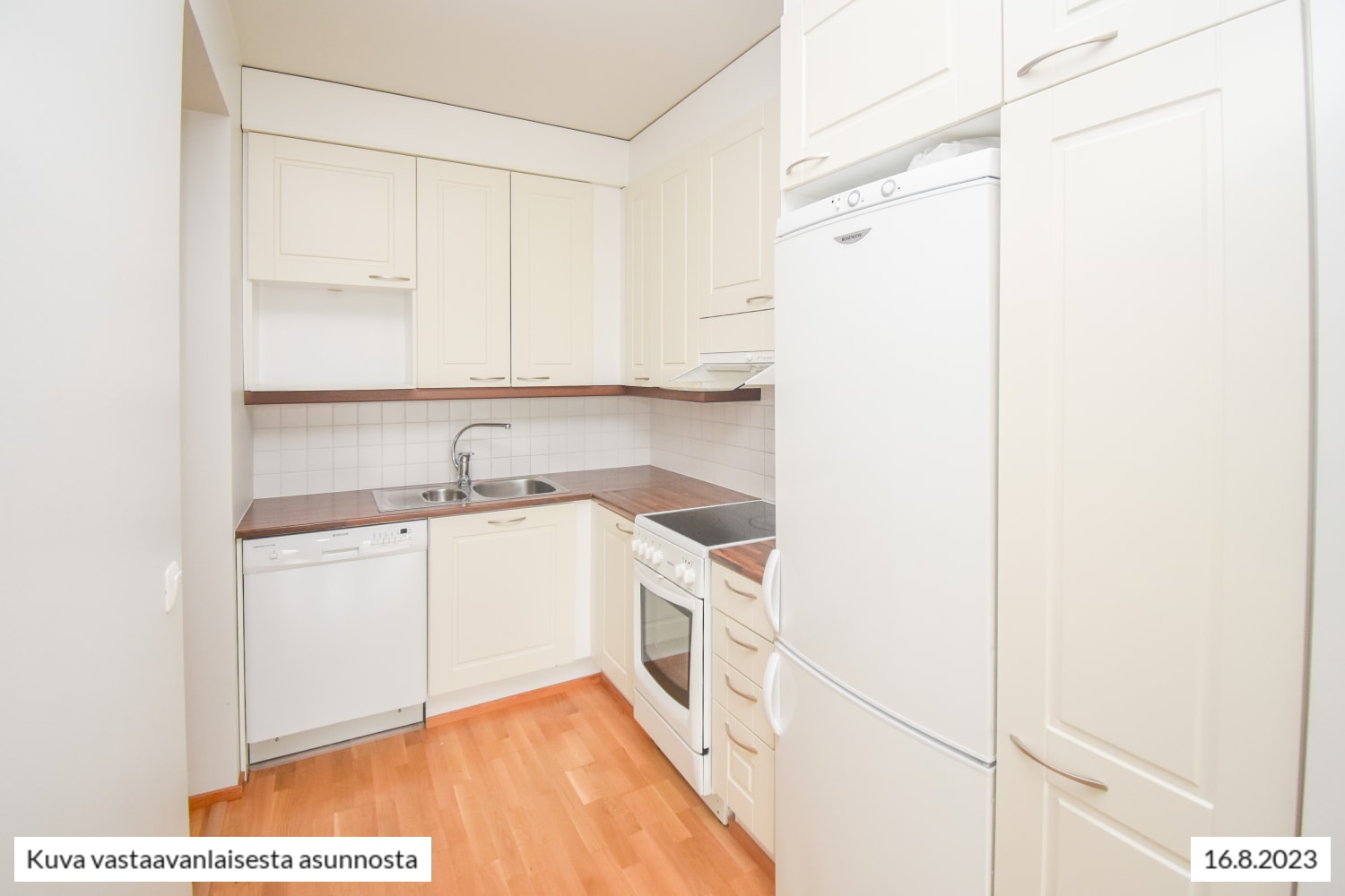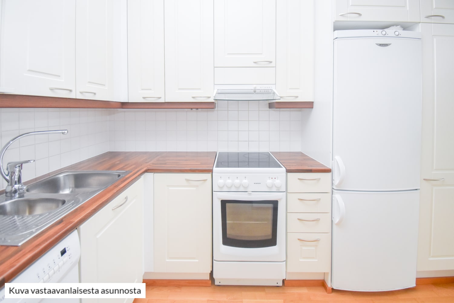 Vaaleasävyinen keittiö on varustettu astianpesukoneella, keraamisella liedellä ja jää-pakastinkaapilla. Keittiökaappien välinen tila on laatoitettu valkoisella.