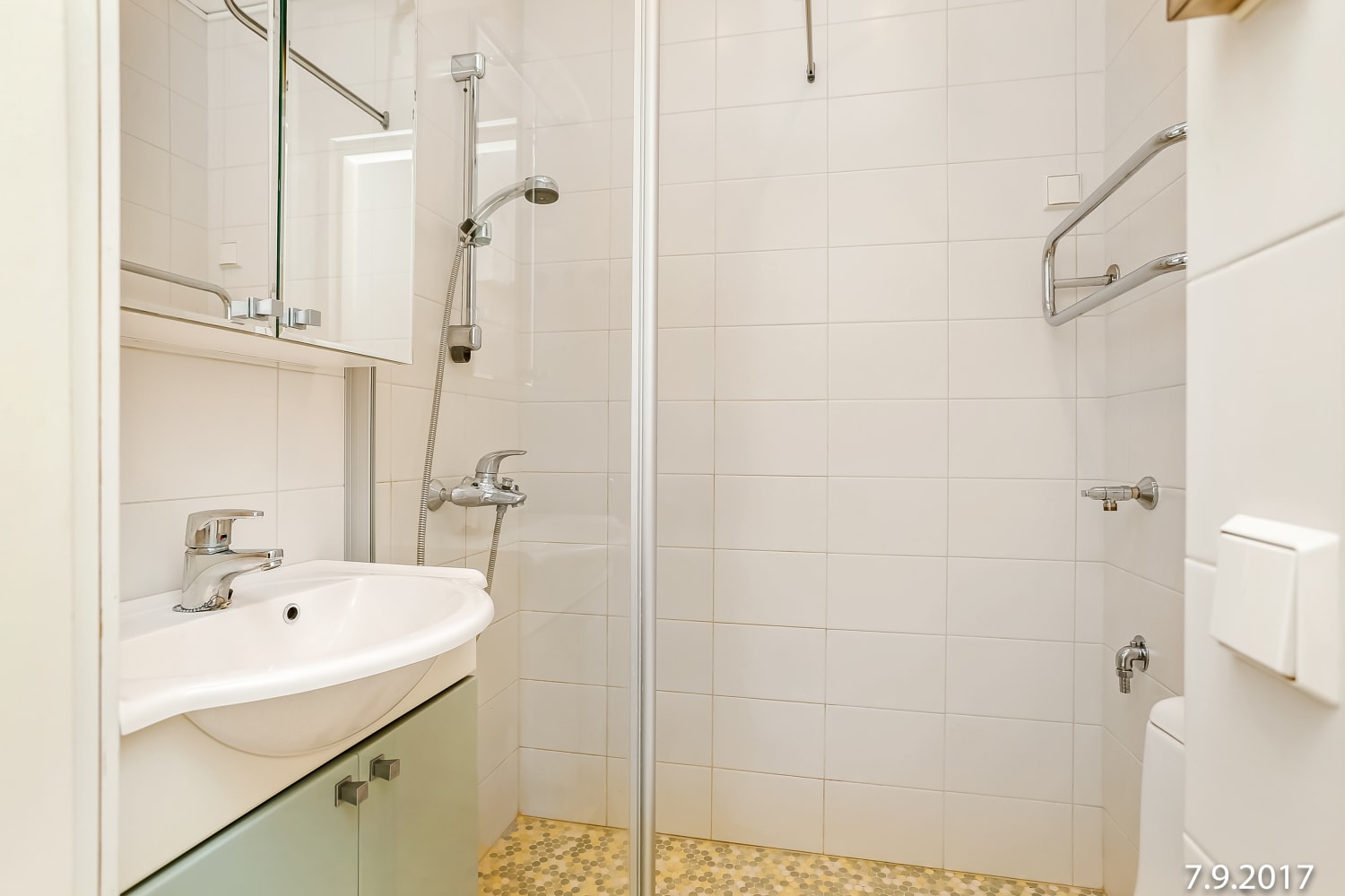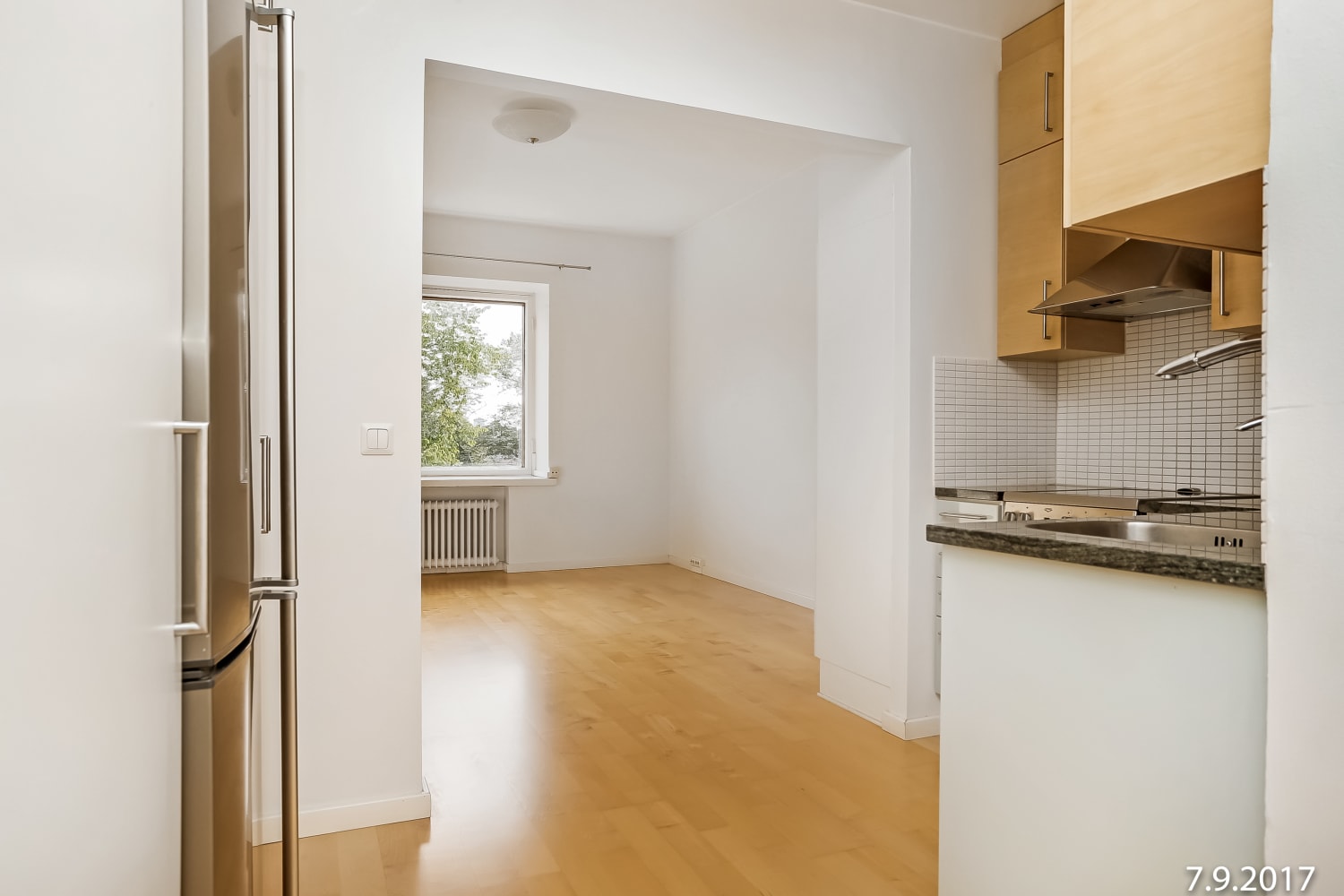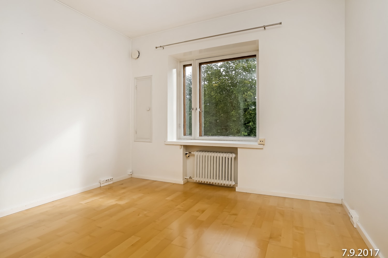Arvostetulla paikalla aivan raitiovaunu 10:n päätepysäkin tuntumassa sijaitseva valoisa asunto viehättää vaaleilla pinnoillaan, persoonallisella kylpyhuoneellaan ja neliöitään avaramman tuntuisella pohjaratkaisullaan. Ikkunasta avautuu esteetön näkymä itään. Asuinhuoneissa on kaunis lautaparketti ja seinien maalissa häivähdys sinivihreää. Keittokomeron yksilöllisiä kaapistoja täydentää komea kivinen työtaso, johon on upotettu keraaminen liesi sekä tiskiallas. UPOn rosteripintainen kalusteuuni ja mikro, Siemensin astianpesukone sekä AEGn tilava jää-pakastinkaappi kuuluvat asunnon vakiovarustukseen. Lattialämmitetyssä kylpyhuoneessa on jalkapohjien alla pehmeäpintaiselta tuntuva mosaiikkilattia ja mattavalkoiset kaakelit. Kirkaslasinen suihkuseinä ja laadukas peilikaappi täydentävät kokonaisuuden.