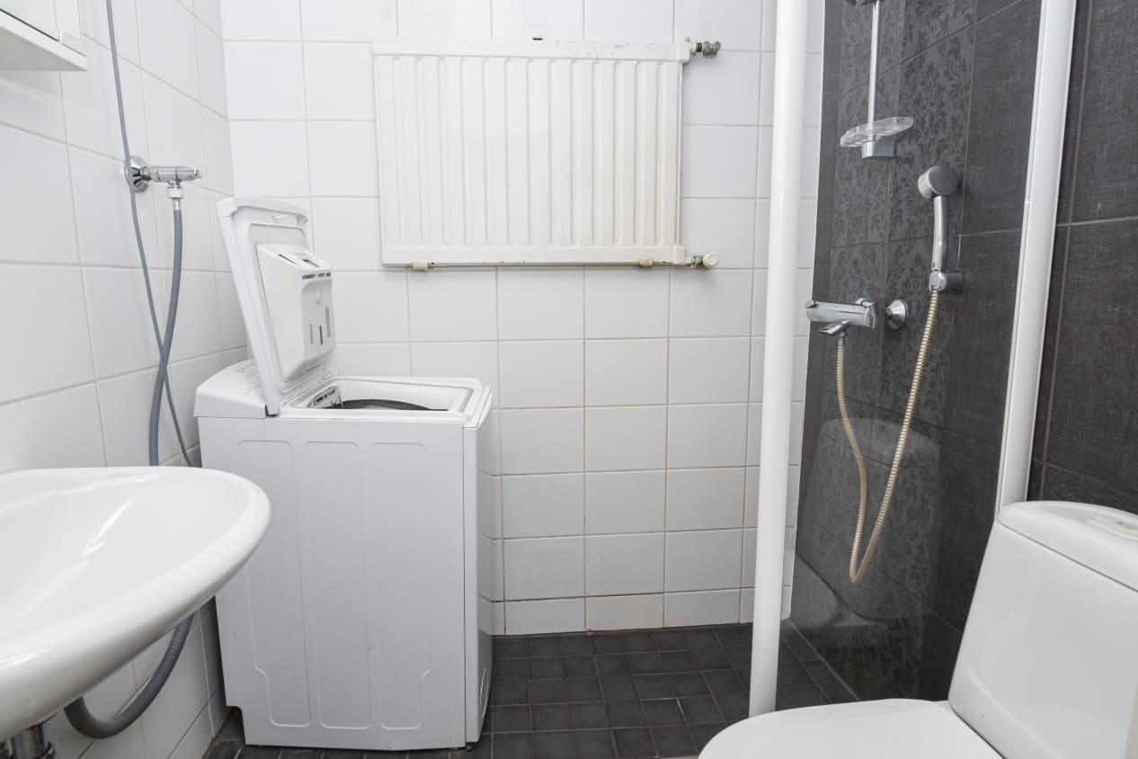 Asuinhuoneissa on laminaattilattiat. Kylpyhuone on kaakeloitu. Keittokomerossa on jää-pakastinkaappi ja nelilevyinen sähköliesi.