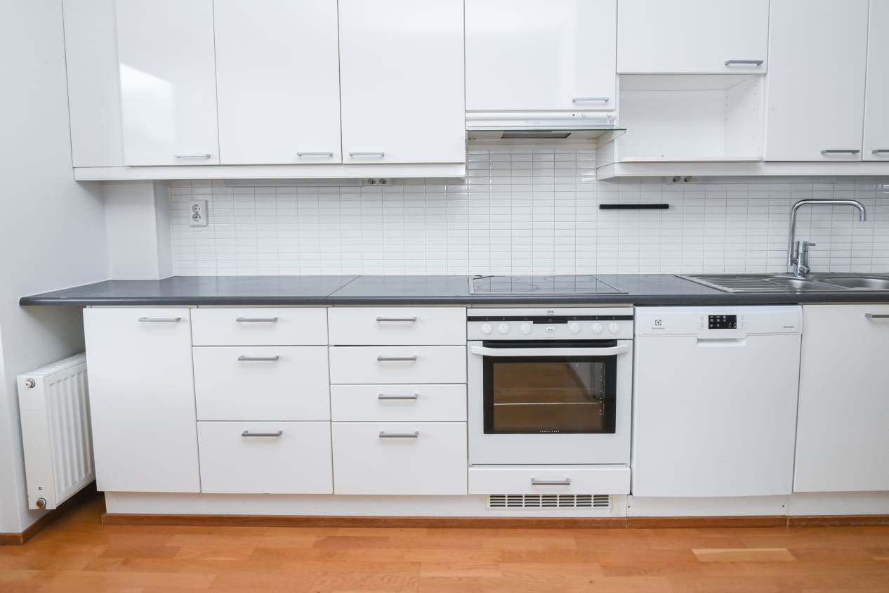 Keittiön vakiovarusteisiin kuuluvat kaksi AEG:n jää-pakastinkaappia, keraaminen liesi uuneineen sekä astianpesukone.