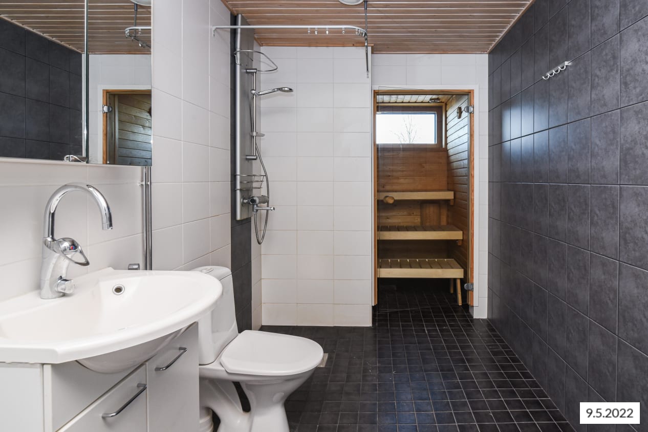 Asuinhuoneissa on tammilaminaattilattia. Kauniissa kylpyhuoneessa on mukavuuslattialämmitys, pehmeän harmaa laattalattia ja seinistä kolme kaakeloitu valkoisella ja yksi tyylikkään grafiitinharmaalla isolla kaakelilla. Eteisen kaapistossa on peiliovet. Keittiössä kiiltävänharmaa alakaapisto täydentyy tummanharmaalla laminaattityötasolla, valkoisella kalustevälikaakeloinnilla ja kiiltävänvalkoisilla yläkaapeilla. Jää-pakastinkaappi, keraaminen liesi ja astianpesukone ovat valkoisia.