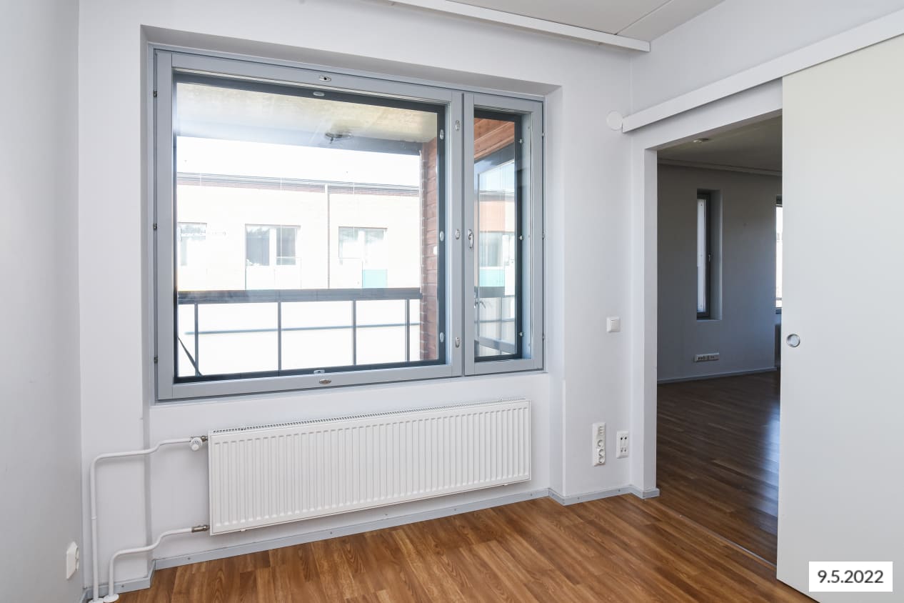 Tässä kaksiossa riittää tilaa ja valoa. Ilmavaan olohuoneeseen mahtuu isompikin sohvaryhmä ja keittiön ikkunan ääressä on passeli paikka ruokapöydälle. Parvekkeelta avautuu pirteä näkymä naapurikortteleihin ja lounaassa siintävään peltomaisemaan.