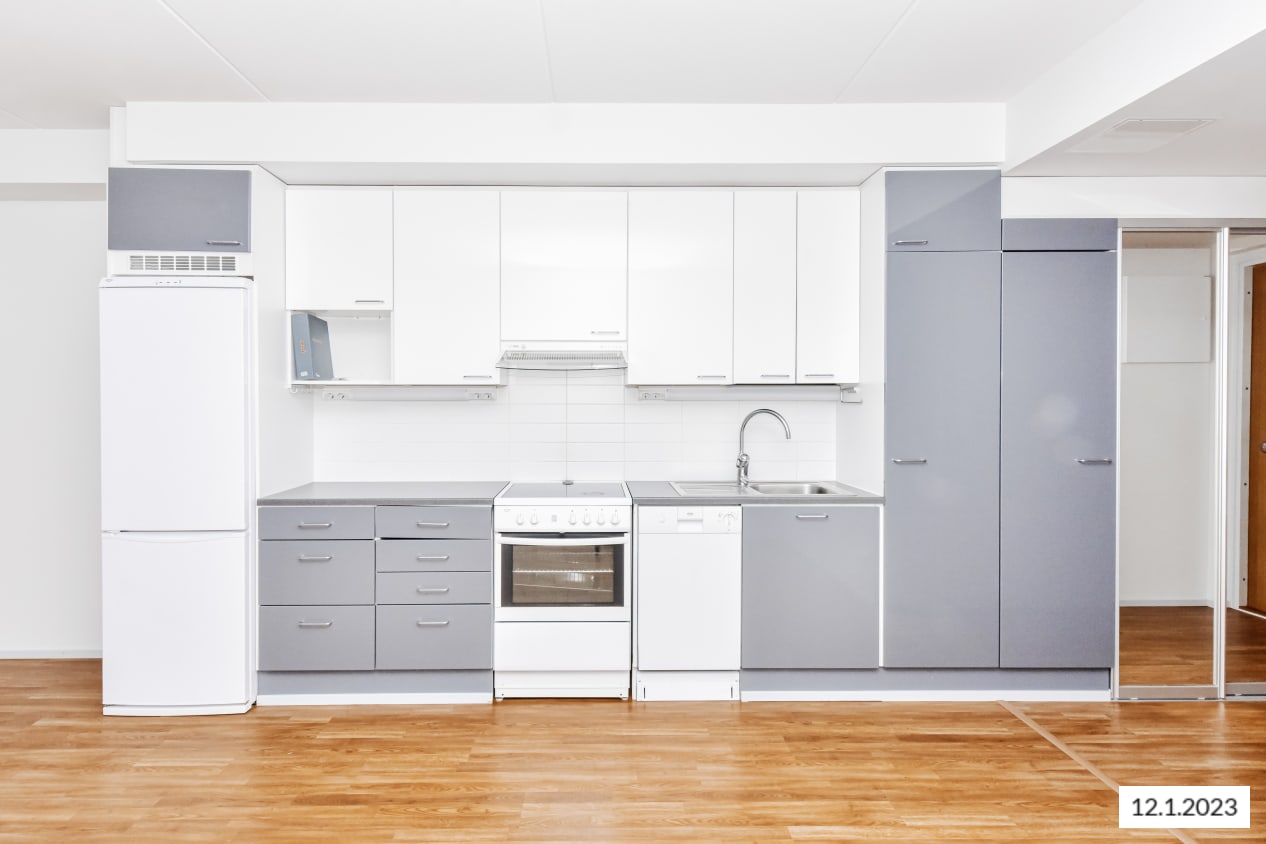 Keittiössä kiiltävän harmaa alakaapisto täydentyy tummanharmaalla laminaattityötasolla, valkoisella kalustevälikaakeloinnilla ja kiiltävänvalkoisilla yläkaapeilla. Jää-pakastinkaappi, keraaminen liesi ja astianpesukone ovat valkoisia.
