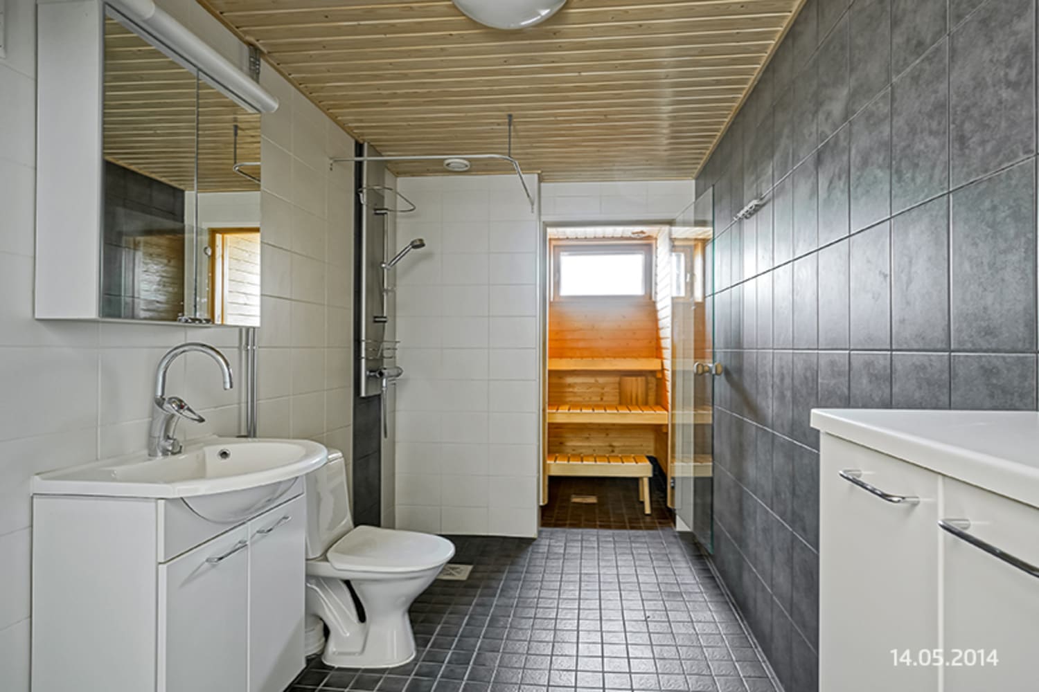 Asuinhuoneissa on tammilaminaattilattia. Kauniissa kylpyhuoneessa on mukavuuslattialämmitys, pehmeän harmaa laattalattia ja seinistä kolme kaakeloitu valkoisella ja yksi tyylikkään grafiitinharmaalla isolla kaakelilla. Eteisen kaapistossa on peiliovet. Keittiössä kiiltävänharmaa alakaapisto täydentyy tummanharmaalla laminaattityötasolla, valkoisella kalustevälikaakeloinnilla ja kiiltävänvalkoisilla yläkaapeilla. Jää-pakastinkaappi, keraaminen liesi ja astianpesukone ovat valkoisia.