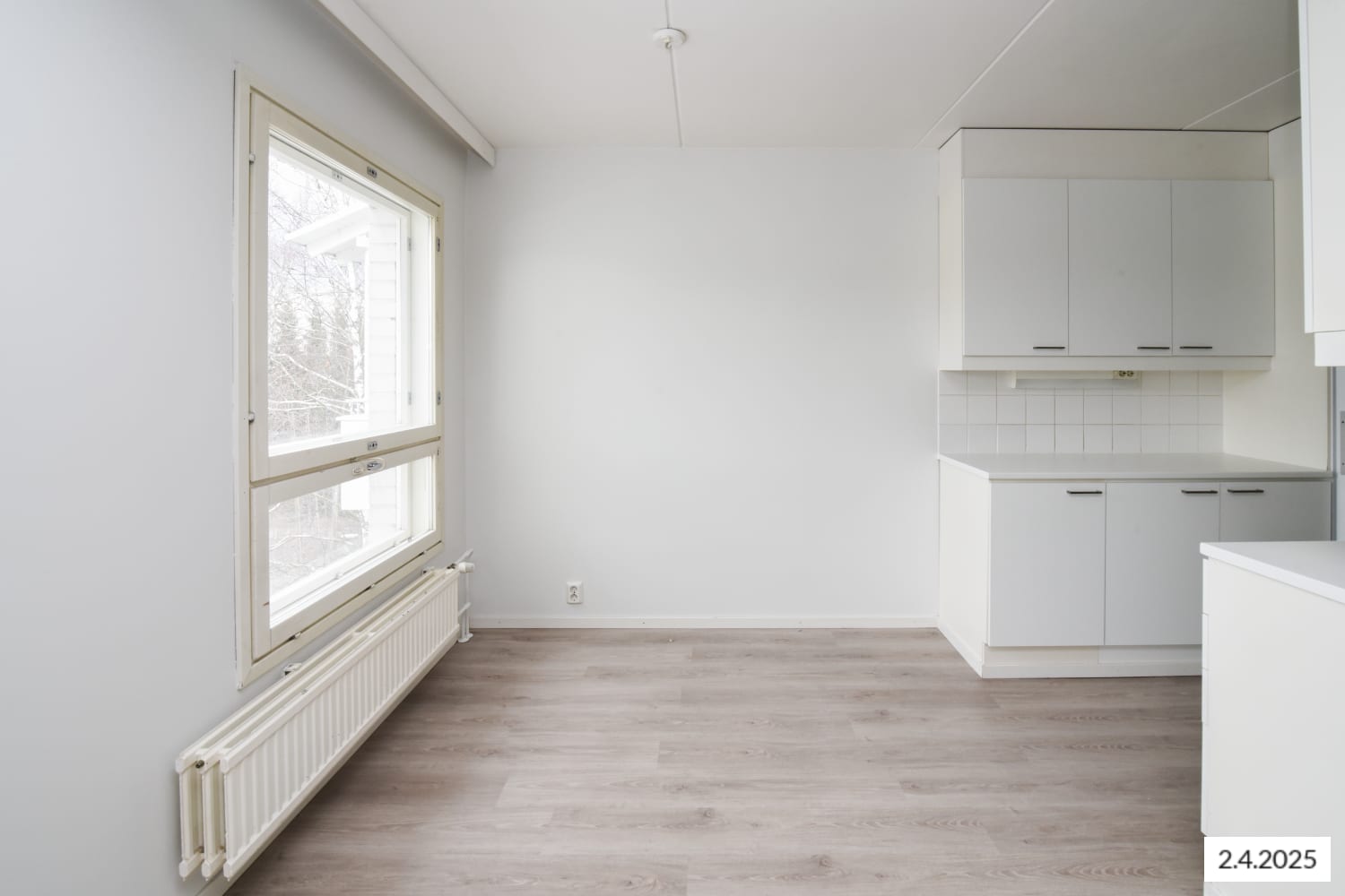 Avarassa keittiössä on mukavasti työskentelytilaa ja paikka ruokapöydälle ikkunan ääressä.